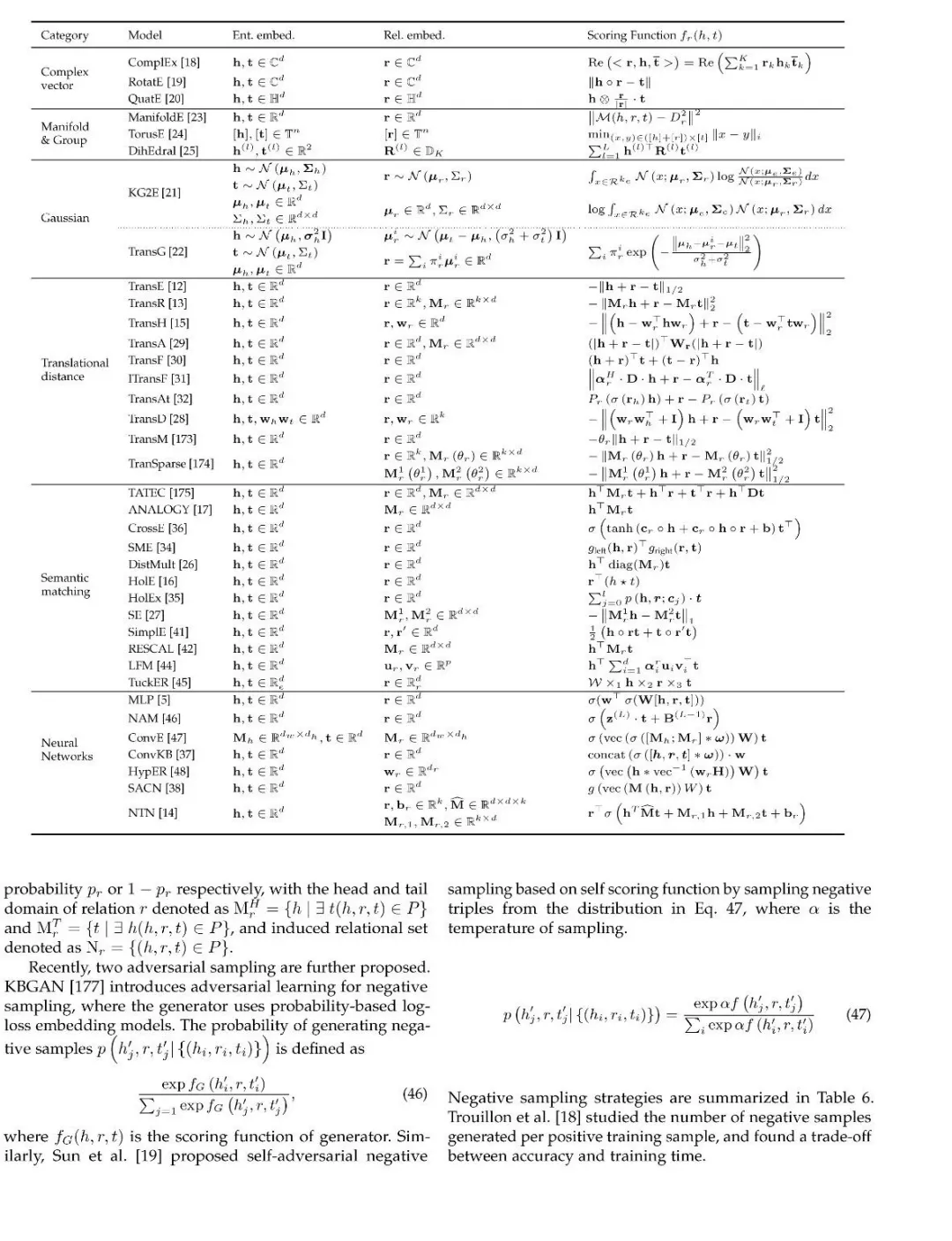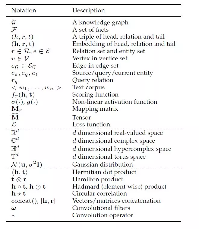 表示学习包括点向空间、流形、复向量空间、高斯分布和离散空间。评分指标一般分为基于距离的评分函数和基于相似度匹配的评分函数。目前的研究集中在编码模型,包括线性/双线性模型,因式分解和神经网络。辅助信息包括文本信息、视觉信息和类型信息。
