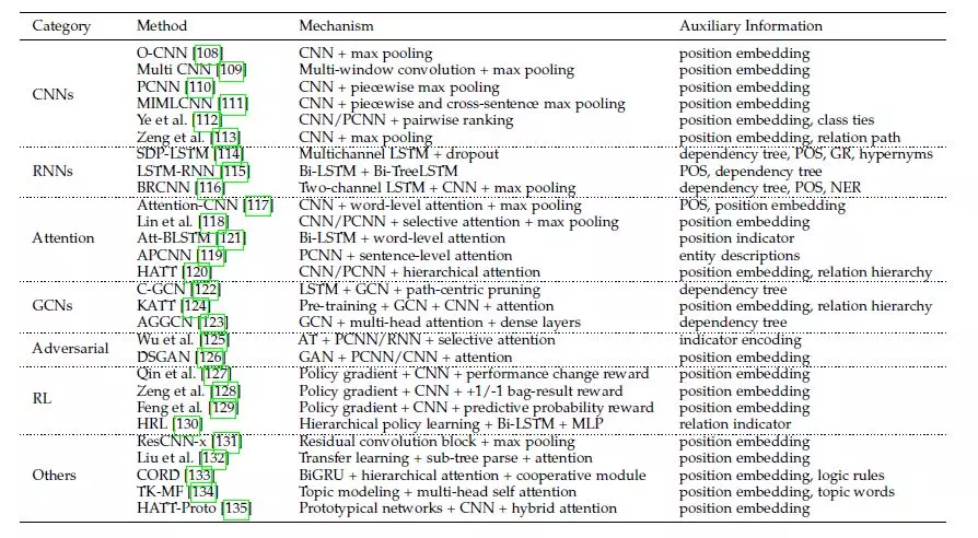 关系抽取在距离监督的假设下存在噪声模式,尤其是在不同领域的文本语料库中。因此,弱监督关系提取对于减轻噪声标记的影响是很重要的,例如,以句子包为输入的多实例学习,软选择超过实例的注意机制[90]以减少噪声模式,以及基于rl的方法将实例选择描述为硬决策。另一个原则是学习尽可能丰富的表示。由于深度神经网络可以解决传统特征提取方法中的误差传播问题,因此该领域以基于dnn的模型为主,如表四所示。