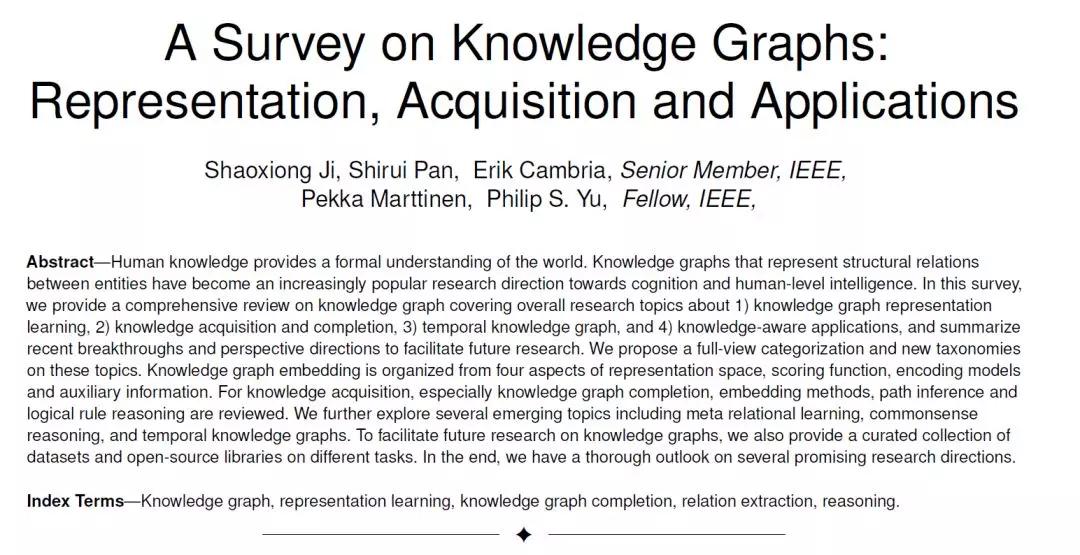【导读】知识图谱一直是学术界和工业界关注的焦点。之前专知报道了AAAI2020相关接受论文。最近Shaoxiong Ji, Shirui Pan, Erik Cambria, Pekka Marttinen, Philip S. Yu等学者发表了关于知识图谱的最新综述论文《A Survey on Knowledge Graphs: Representation, Acquisition and Applications》,25页pdf涵盖107篇参考文献,对知识图谱进行了全面的综述,涵盖了知识图谱表示学习、知识获取与补全、时序知识图谱、知识感知应用等方面的研究课题,并总结了最近的突破和未来的研究方向。我们提出对这些主题进行全视角分类和新的分类法。是关于知识图谱最近非常重要的参考文献。