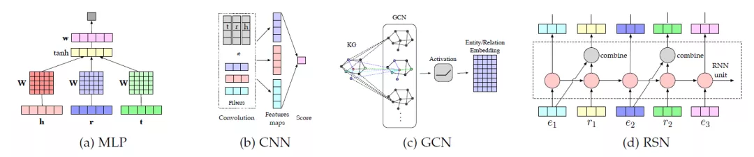 图5: 神经编码模型示意图。(a) MLP[33]和(b) CNN[110]将三元组数据输入到稠密层和卷积运算中学习语义表示,(c) GCN[132]作为知识图谱的编码器,产生实体和关系嵌入。(d) RSN[50]对实体关系序列进行编码,有区别地跳跃关系。