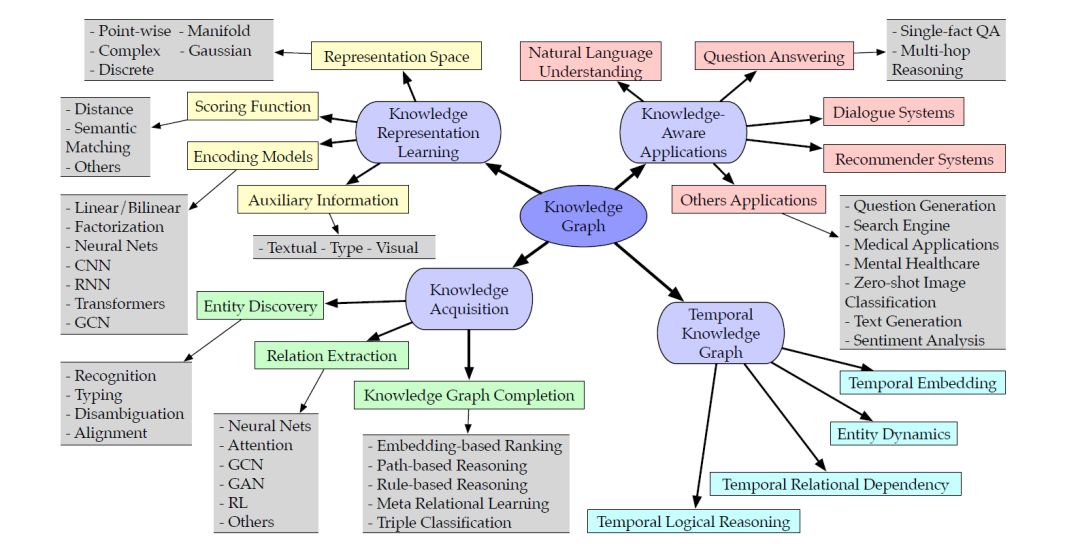 本综述对知识图谱的研究,即KRL、知识获取、下游知识感知应用等方面进行了全面的文献综述,整合了许多最新的先进深度学习技术。研究的总体分类如图2所示。