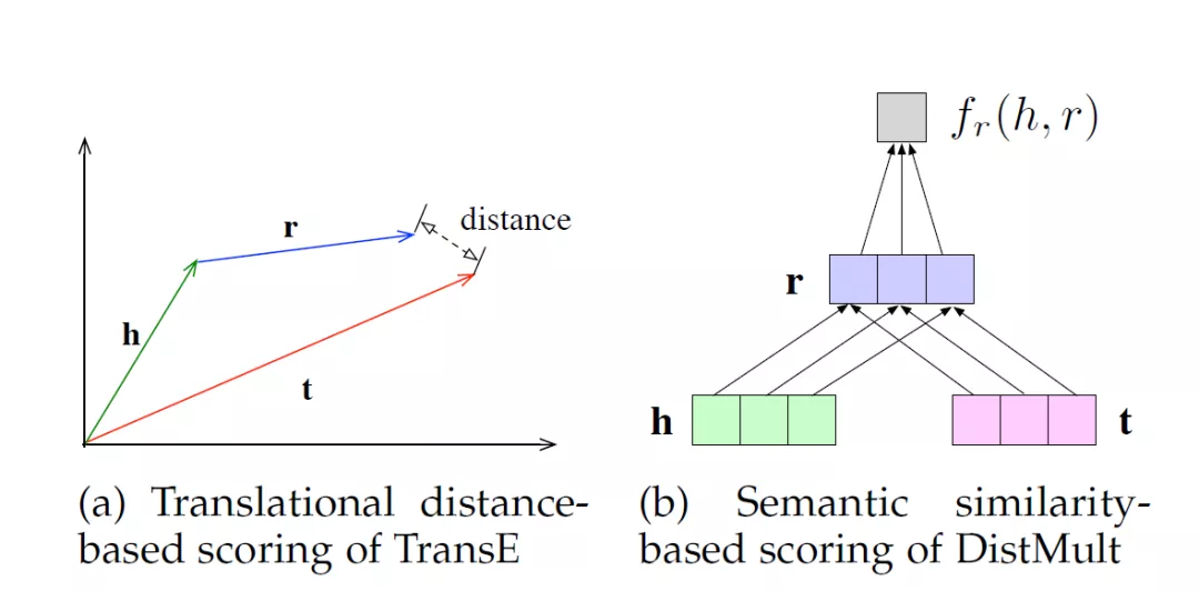 图4: 以TransE[10]和DistMult[185]为例的基于距离和基于相似匹配的评分函数示意图。