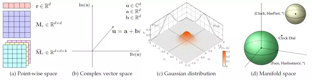 表示学习的关键是学习低维分布式嵌入的实体和关系。现有文献主要使用实值点向空间(图2(a)),包括向量空间、矩阵空间和张量空间,其他类型的空间如复向量空间(图2(b))、高斯空间(图2(c))、流形空间(图2(d))也被利用。