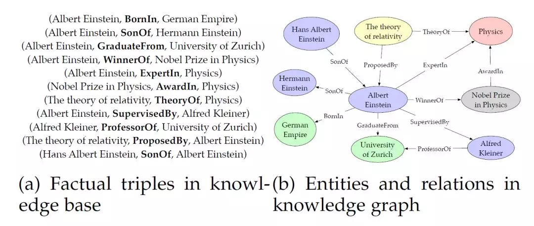 例如(Albert Einstein; WinnerOf; Nobel Prize). 它也可以表示为一个有向图,其中节点是实体,边是关系。为了简化和顺应研究领域的发展趋势,本文将知识图谱和知识库这两个术语互换使用。