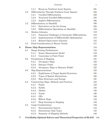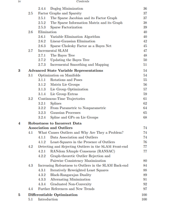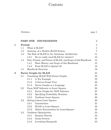 第一部分涵盖SLAM的基础知识,特别关注用于SLAM后端的估计理论工具和SLAM可以生成的不同类型的地图表示。具体来说: * 第2章 介绍SLAM的因子图表示,并回顾如何通过迭代非线性优化方法求解。 * 第3章 迈出了不可或缺的一步,将该表示扩展到平滑流形上的变量估计,例如旋转和位姿。 * 第4章 讨论了如何在SLAM后端中建模和缓解异常值和数据关联错误的影响。 * 第5章 回顾了使后端优化可微分的技术,这是连接传统SLAM方法与最新深度学习架构的关键步骤。 * 第6章 将重点从后端转移到密集地图表示的问题,讨论SLAM中最重要的表示方法。 * 第7章 讨论了更高级的求解器和SLAM后端的理论属性。