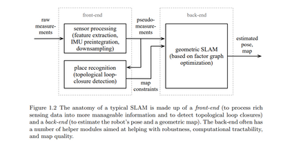 间接方法自然在常见的SLAM架构中形成了模块分工(图1.2):原始传感器数据首先传递给一组算法(SLAM前端)以提取中间表示;然后将这些中间表示传递给估计器(SLAM后端),由后端估计感兴趣的量。前端通常还负责构建初始猜测:这是后端用于迭代优化的初始估计,从而减轻非凸性引发的收敛问题。以下将通过几个例子进一步澄清SLAM前端和后端之间的区别。