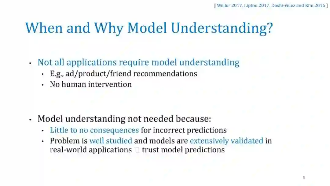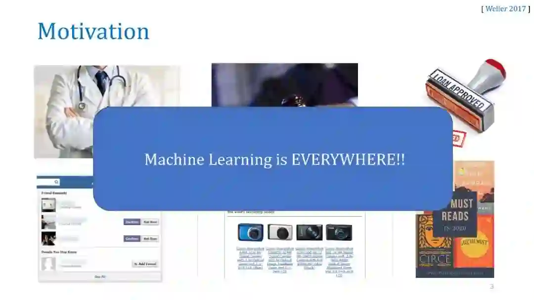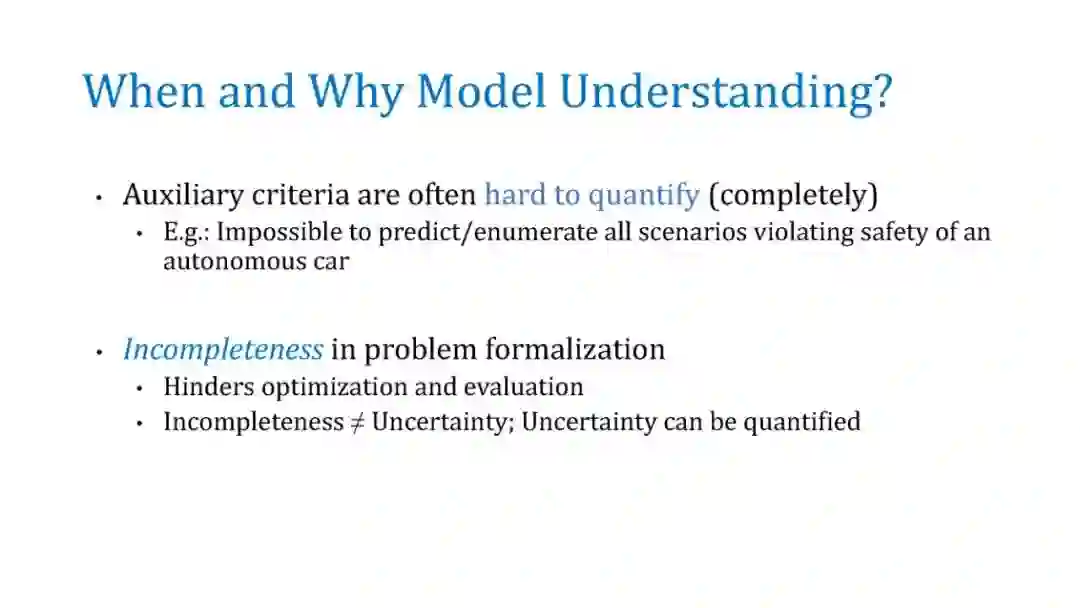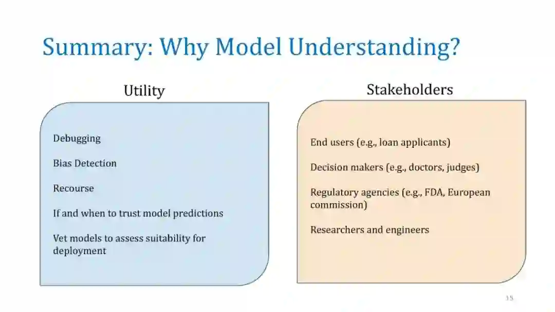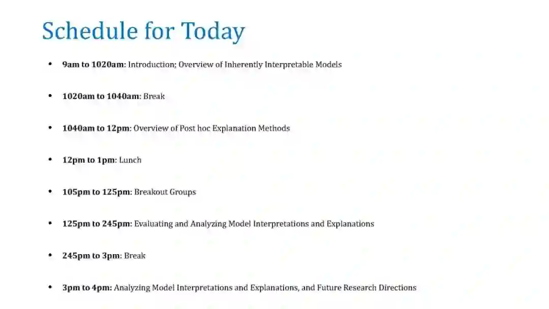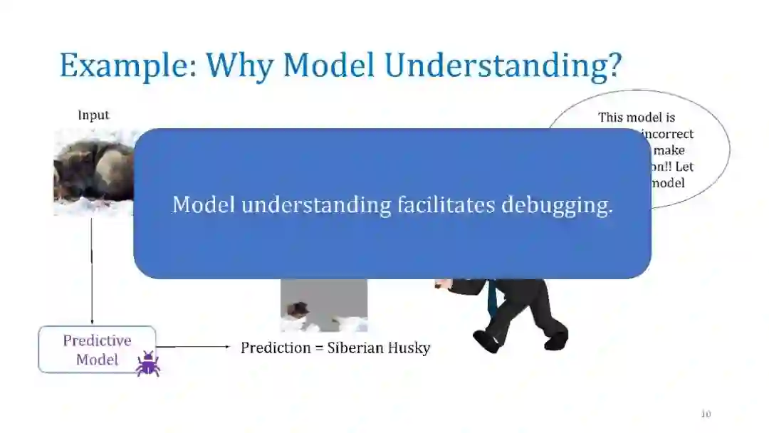 在本教程中,我们将讨论几种事后解释方法,并重点讨论它们的优缺点。我们将涵盖三大类技术:(a)单实例基于梯度的归因方法(显著图),(b)通过扰动的模型不可知论解释,如LIME和SHAP,以及(c)全局可解释性的代理建模,如MUSE。对于每一种方法,我们将提供它们的问题设置、突出的方法、示例应用程序,最后讨论它们的漏洞和缺点。我们希望为机器学习中的可解释性提供一个实用而深刻的介绍。