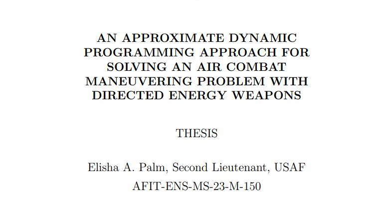 在视距(WVR)内进行空战需要执行复杂的空中机动和快速的顺序决策。如果加入额外的武器能力,这些决策的复杂性还会进一步增加。无人自主飞行器技术和武器能力的发展有助于克服人为限制带来的障碍。事实证明,自主无人作战飞行器(AUCAV)和定向能武器(DEW)等先进武器能力在 WVR 空战中至关重要。这就引出了一个问题--AUCAV 能否拥有适当的人工智能和武器能力,以改进高质量的空战演习和战术?为了研究这个问题,我们提出并解决了广义空战机动问题(ACMP),在这个问题中,我们建立了一个模型,以控制正在寻求与攻击敌机交战的防御型 AUCAV。该模型利用每架飞机的 5 自由度点质量来跟踪其状态转换,同时还跟踪内部携带的火炮和 DEW 能力。由于该问题的维度较高,我们提出了一种近似动态编程(ADP)方法,其中我们开发了一种近似策略迭代算法。这种 ADP 算法通过神经网络回归来实现高质量的战斗机战术和机动。我们的计算实验结果表明,在 3 个问题实例中,有 2 个实例的 ADP 策略优于所有 3 个基准策略。ADP 策略学会了同时使用内部携带的火炮和 DEW,这促进了 ACMP 中任一武器平台的态势效益理念。在 WVR-ACMP 中加入 DEW 功能可以体现前所未有的空战战术。