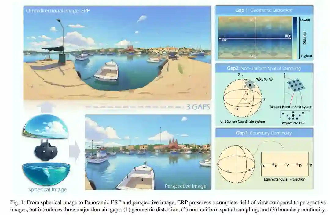摘要——在空间智能与整体场景感知需求的驱动下,提供完整 360° 视场的全景图像(Omnidirectional Images, ODIs)正在虚拟现实、自动驾驶和具身机器人等多种应用中受到越来越多的关注。尽管具有独特特性,ODIs 在几何投影、空间分布与边界连续性方面与透视图像存在显著差异,这使得直接基于现有透视方法的领域自适应极具挑战。本文对全景视觉的最新技术进行了全面综述,特别强调了从透视到全景的适配问题。首先,我们回顾了全景成像流程与投影方法,以建立分析 ODIs 与透视图像结构差异所需的先验知识。随后,我们总结了领域自适应中的三大挑战:极点区域的严重几何畸变、等矩形投影(Equirectangular Projection, ERP)的非均匀采样,以及全景边界的周期连续性。在此基础上,我们涵盖了 300 余篇研究论文中的 20 余个代表性任务,并从两个维度进行讨论:一方面,跨方法地分析了不同任务中应对全景特定挑战的代表性策略;另一方面,跨任务地进行比较,将全景视觉划分为四大类:视觉质量增强与评估、视觉理解、多模态理解和视觉生成。此外,我们还探讨了开放挑战与未来方向,重点强调将推动全景视觉研究发展的数据、模型与应用。与以往侧重于任务特定流程的综述不同,本文提供了更为统一且动态演进的全景视觉学习图景。我们希望本研究能为推动全景视觉技术的发展提供新的洞见与前瞻性视角。我们的项目页面为 https://insta360-research-team.github.io/Survey-of-Panorama/。 关键词——全景视觉,领域差异,投影畸变。