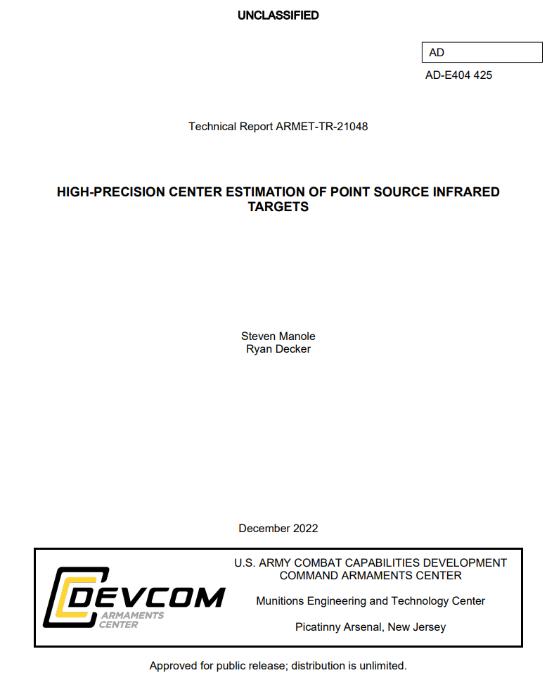 本报告的目的是探讨可用于估计红外(IR)目标中心的多种方法。具体的重点是在一个非常小的空间区域发出信号的目标,近似于一个点源。如果只需要一个简单的解决方案,中心可以被大致估计为感兴趣区域(ROI)中最亮的像素。虽然很容易实现,但这种方法只能产生一个精确到单个像素的估计。如果没有任何进一步的细化,这将建立一个精度的下限。然而,通过考虑邻近的像素,有可能将估计值细化到一个像素的一小部分。因此,选定的算法必须能够进行亚像素估计,以便为高精确度的应用建立必要的精确程度。这些应用中的几个可能包括在整个视频中跟踪一个投射物或使用红外目标进行相机校准。