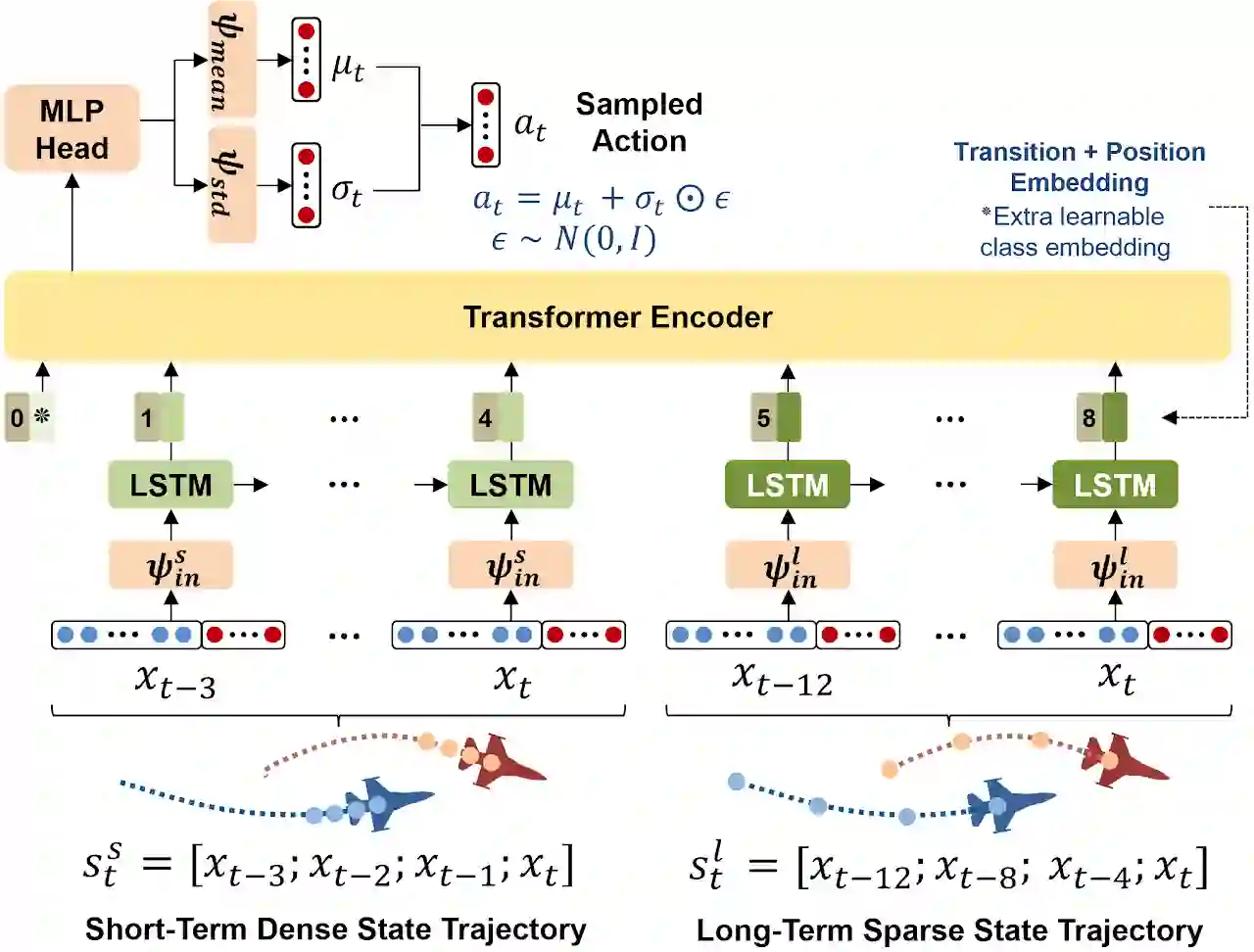 长短期时态融合变换器(或称 TempFuser)是一种网络架构,专为空中激战中的策略模型而设计。该架构使用基于 LSTM 的输入嵌入和变换器编码器。它处理两种类型的状态轨迹:代表机动级状态转换的长期时间轨迹和表示动态级状态转换的短期时间轨迹。每种轨迹都使用基于 LSTM 的管道进行嵌入,然后通过变换器编码器进行整合。随后,使用多层感知器(MLP)模块和高斯策略架构将编码器输出转换为飞行指令。