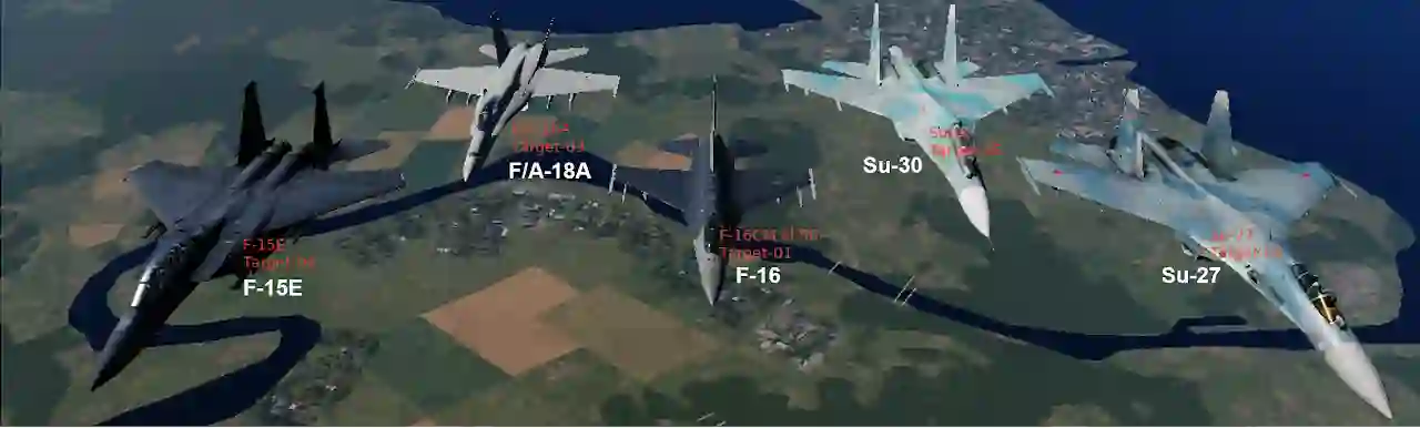 不同类型的飞机为对手:F- 15e, F/A-18A, F-16,苏-30,苏-27。