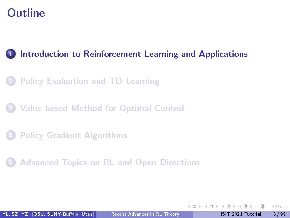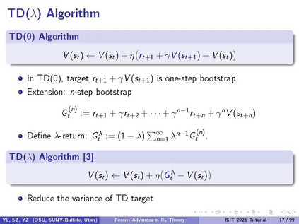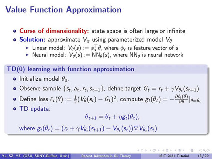 强化学习(RL)通过与复杂环境的交互,推动机器学习从基础数据拟合到学习和规划的新时代。RL具有深度学习功能,在自动驾驶、推荐系统、无线通信、机器人、游戏等领域取得了巨大的成功。RL的成功很大程度上是基于RL算法的基础发展,直到最近才被彻底理解,特别是它们的有限时间收敛速度和样本复杂性。本教程将全面概述基础RL算法的理论理解的最新进展,利用随机近似/优化理论和利用RL问题的马尔可夫结构。本教程还将介绍一些高级的RL算法及其最近的发展。