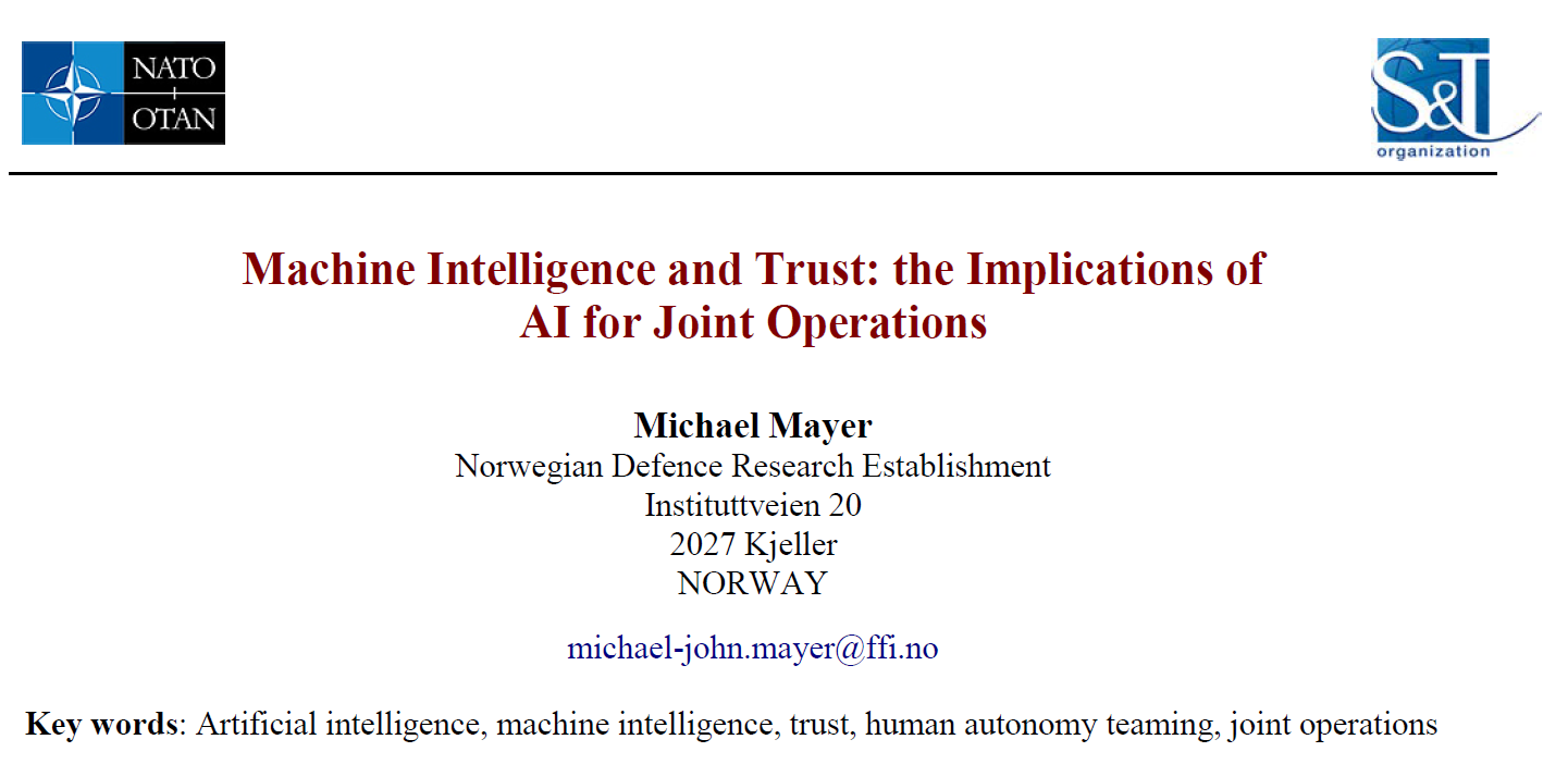 新兴技术的整合提出了任何数量的基本组织和伦理问题,值得关注。本文将采用定性的社会科学方法,重点讨论人类-自治团队(HAT)的一个重要方面:鼓励对机器智能的适当信任程度。有大量的学术文献关注自动化或机器人技术中的信任问题,但有关具体军事应用的工作较少。当人工智能在联合作战中被实际部署时,在信任方面有哪些挑战和机会?在简要回顾人工智能和概述机器智能在战场上的可能应用之后,本文在分析鼓励适当信任水平的陷阱和潜在解决方案之前,探讨了信任和信任校准的概念。