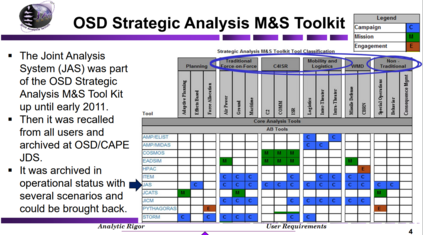 它是一个完整的多领域模型,具有平衡的空中、陆地、海上、太空和C4ISR,包括C2、EW、欺骗和网络。此外,还完全集成了后勤和运输、人类软因素、TBM/TBMD和WMD。