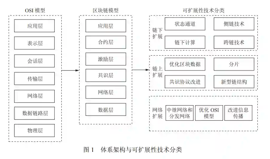 ● 从网络层、链上层、链下层这 3 个方面更充分地定义可扩展性, 提出可以衡量可扩展性的通用指标. ● 提出对可扩展性方案通用的分类框架, 将现有方案分为提升底层区块链网络性能网络扩展, 优化区块链自 身属性的链上扩展, 扩充区块链功能的链下扩展这 3 大类型. ● 总结各类可扩展性解决方案的特点, 并进行分析对比. 并对区块链可扩展性的未来研究方向进行开放性讨论. 本文第 1 节解释区块链的一些基本概念和术语. 第 2 节定义可扩展性问题并提取通用的衡量指标. 第 3 节给 出可扩展性通用分类框架, 并对每一类技术方案进行分析对比. 第 4 节汇总比较可扩展性技术, 并进行更宏观的开 放性问题讨论.