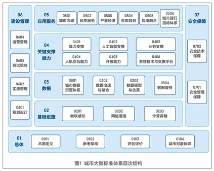 3、标准体系层次结构。城市大脑标准体系层次结构包括“01总体”“02基础设施”“03数据”“04关键支撑能力”“05应用服务”“06建设管理”“07安全保障”等七个部分,如图所示。