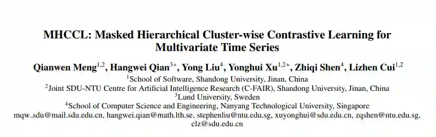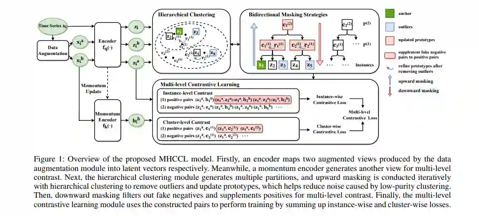从原始无标签时间序列数据中学习语义丰富的表示,对于分类和预测等下游任务至关重要。最近,对比学习在没有专家注释的情况下显示出了很好的表示学习能力。然而,现有的对比方法通常独立地对待每个实例,从而导致具有相同语义的假负样本对。为了解决这一问题,本文提出了一种掩码层次聚类对比学习模型MHCCL,利用多元时间序列的多个潜在分区组成的层次结构所获得的语义信息。细粒度聚类保持了较高的纯度,而粗粒度聚类反映了更高层次的语义,受此启发,本文提出了一种新的向下屏蔽策略,通过融合来自聚类层次的多粒度信息来过滤假负样本并补充正样本。此外,MHCCL设计了一种向上掩蔽策略,在每个划分处去除聚类的离群点,以完善原型,有助于加快层次聚类过程,提高聚类质量。在7个广泛使用的多元时间序列数据集上进行了实验评估。实验结果表明,MHCCL比目前最先进的无监督时间序列表示学习方法具有优越性。
