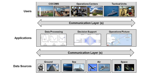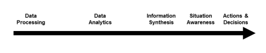 作为一个例子,已经有一些工作将 "数据整合 "推向了前进的方向,并展示了态势感知的操作能力。这些工作说明了从各种来源的数据,到通过各种软件应用的信息,再到呈现给操作者或用户的知识转换(图2)。通过应用处理层来创建一个增强的态势感知图,它使高级领导人能够更自信地采取行动和做出决定。这些处理层包括从简单的可视化数据摄取到分类服务以提供任务事件的背景。所有这些都为决策支持提供了不同程度的信息。
