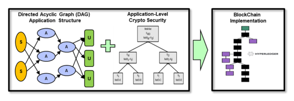 区块链方法通过提供一种有机的方法来解决验证问题,用于存储数据、处理出处和证明同步,同时提供系统的弹性和增加最小的延迟。图5显示了我们如何利用典型数据处理链的有向无环性质来覆盖加密安全并实现区块链。这种数据结构与传统的区块链应用是直接匹配的。在源层(S)和应用层(A)的每一步都有轻量级的加密安全,用户(U)可以验证正在呈现的数据。这种架构提供了以下方法:配置管理(每个软件更新都有一个独特的安全标签),错误取证(通过处理的每个路径都有一个独特的ID),并防止某些类型的恶意攻击(每个独特的ID都登记在一个用户可以使用的账本上)。