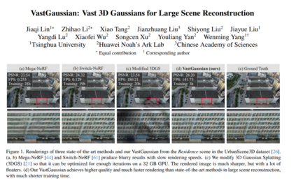 现有基于NeRF的大场景重建方法通常在视觉质量和渲染速度上有限制。虽然最近的3D高斯Splatting在小规模和以物体为中心的场景上表现良好,但将其扩展到大场景上存在挑战,因为受到视频内存有限、优化时间长和明显的外观变化的限制。为了应对这些挑战,我们提出了VastGaussian,这是第一个基于3D高斯Splatting的大场景高质量重建和实时渲染方法。我们提出了一种渐进式分割策略,将大场景分割成多个单元,其中训练相机和点云以空域感知的可见性标准适当分布。这些单元在并行优化后合并成一个完整的场景。我们还在优化过程中引入了解耦的外观建模,以减少渲染图像中的外观变化。我们的方法超越了现有的基于NeRF的方法,并在多个大场景数据集上达到了最先进的结果,实现了快速优化和高保真的实时渲染。项目页面:https://vastgaussian.github.io。