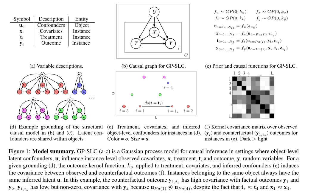 摘要:潜在干扰因子(confounders)-影响介入选择和结果的一些未观察到的变量-可能会对因果效应的估计产生偏差。在某些情况下,这些干扰因子在不同的观察中是相同的,例如,一所学校的所有学生除了单独接受任何教育的干预外,还受到学校文化的影响。本文展示了如何对具有这种结构的潜在干扰因子进行建模,从而改进对因果效应的估计。主要创新点是分层贝叶斯模型、带结构干扰因子的高斯过程(Gaussian processes with structured latent confounders, GP-SLC)和基于椭圆切片采样(elliptical slice sampling)的蒙特卡罗推理(Monte Carlo inference)算法。GP-SLC提供个体治疗效果的原则性贝叶斯不确定性估计,对与干扰因子、协变量、介入和结果相关的函数形式的假设最少。本文还证明,对于线性函数形式,考虑潜在干扰因子中的结构对于因果效应的渐近相容估计是充分的。最后,本文证明了GP-SLC与等级线性模型( multi-level linear models)和贝叶斯加性回归树(Bayesian additive regression trees)等广泛使用的因果推理技术相比具有竞争力或更高的精确度。基准数据集包括 Infant Health 和Development Program ,以及显示温度变化对整个新英格兰全州能源消耗的影响的数据集。