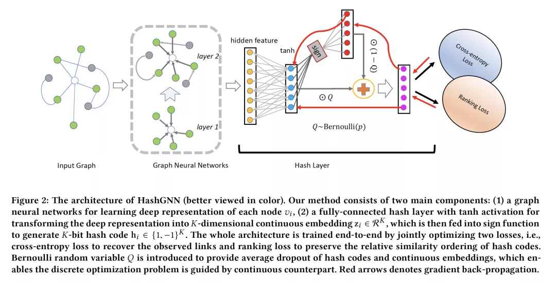 摘要:工业推荐系统一般包括两个阶段:召回和排名。召回是指从海量的项目语料库中高效地识别出数百个用户可能感兴趣的候选项目,而排名的目标是使用复杂的排名模型输出精确的排名列表。近年来,图表示学习在支持大规模高质量候选搜索方面受到了广泛关注。尽管它在用户-项目交互网络中学习对象的嵌入向量方面是有效的,但在连续嵌入空间中推断用户偏好的计算代价是巨大的。在这项工作中,我们研究了基于图神经网络(GNNs)的哈希高质量检索问题,并提出了一种简单而有效的离散表示学习框架来联合学习连续与离散编码。具体地说,提出了一种基于GNN的深度哈希算法(HashGNN),它由两部分组成,一个是用于学习节点表示的GNN编码器,另一个是用于将表示编码为哈希码的哈希层。整个框架通过联合优化以下两个损失进行端到端的训练,即通过重建观察到的连接而产生的重建损失,以及通过保留哈希码的相对顺序产生的排序损失。我们还提出了一种基于直通估计器(straight through estimator ,STE)指导的离散优化策略。其主要思想是在连续嵌入指导下避免STE的反向传播中的梯度放大,在这种情况下,我们从学习一个更容易模仿连续嵌入的更简单的网络开始,并使其在训练过程中发展直至最终返回STE。在三个公开可用数据集和一个真实的阿里巴巴公司数据集的综合实验表明,我们的模型不仅可以达到连续模型的性能,而且在推理过程中运行速度快了好几倍。