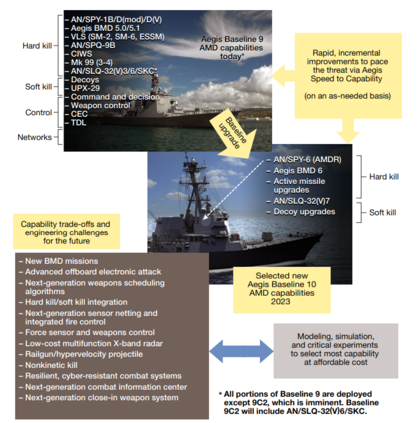 宙斯盾驱逐舰和巡洋舰是海军最有能力的防空单位,因为它们拥有远程、多功能相控阵雷达;拥有许多不同的反空战、弹道导弹防御和电子战武器;以及处理传感器数据、做出交战决定和控制这些武器的复杂控制程序。宙斯盾驱逐舰和巡洋舰可以在弹道导弹飞行的中途阶段用外大气层的标准导弹-3(SM-3)系列击败它们,也可以在弹道导弹的末端阶段用内大气层的SM-6系列击败它们,从而防御大片地区的弹道导弹。部署在欧洲的 "宙斯盾 "岸上作战系统在陆地上使用相同的探测-控制-接触组件的一个子集,为美国部署的部队、他们的家人和我们在欧洲的盟友提供外大气层防御。宙斯盾弹道导弹防御系统(BMD)舰艇和宙斯盾岸上系统是更大的弹道导弹防御系统(BMDS)的一部分,该系统本身是一个全球作战系统,整合了海军、陆军和空军的探测、控制和接触组件。宙斯盾驱逐舰和巡洋舰也能击败来自飞机和巡航导弹的攻击。宙斯盾系统能够使用SM-6地对空导弹在海上和陆地上对飞机和巡航导弹进行远距离交战。在综合火控支持下,SM-6提供了一个更大的战斗空间来对付地平线上的威胁。在地平线内,宙斯盾可以使用SM-2导弹系列和进化型海麻雀导弹(ESSM)保卫自己(自卫)和其他单位(区域防御)。宙斯盾还可以使用电子战措施,如干扰和诱饵来击败威胁。合作交战能力(CEC)和战术数据链(TDL)网络使宙斯盾和其他单位能够作为一个协调的力量进行战斗。