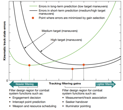 图9. 为了满足交战误差预算,大多数作战系统为不同的作战系统功能以不同的方式处理传感器测量数据。例如,较重的跟踪过滤(较小的过滤增益)将产生运动学估计,由于测量噪声而产生较小的方差,并能进行较长期的时间预测。较轻的跟踪过滤将产生对不可预测的目标运动(机动)更宽容的运动学估计。