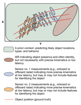 图5说明了关联和跟踪问题。在世界任何地方的任何一天,作战人员一般都有一个先验的背景信息可用。这种背景将定义谁是可能的敌人,他有什么样的威胁,以及,一般来说,他可能如何攻击。在今天的作战系统中,这些信息被视为 "理论",是定义作战系统如何应对传感器信息的规则集合。例如,今天的识别理论定义了,考虑到背景,哪些额外的传感器证据对于最终识别目标是必要的。下一个可能输入作战系统的是来自ISR(情报、监视和侦察)的一些早期指示,即攻击即将来临;这种早期指示提醒作战系统注意物体的存在,并经常识别目标,但它不一定提供精确的运动学或低延迟。今天,几乎没有将背景数据和ISR数据与有机传感器进行定量整合。先验背景和ISR的定量整合是新作战系统设计的一个挑战和增长点。