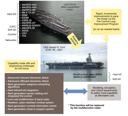 航空母舰和两栖舰能够投射进攻性力量(海军航空和岸上的海军陆战队)。然而,这些舰艇上的防空和导弹防御探测-控制-交战组件通常仅限于自卫。自卫是通过电子战、短程导弹系统如ESSM和滚动机体导弹(RAM)或火炮(如Phalanx近程武器系统,或CIWS)来实现的。这些舰艇的作战系统是舰艇自卫系统(SSDS)。
