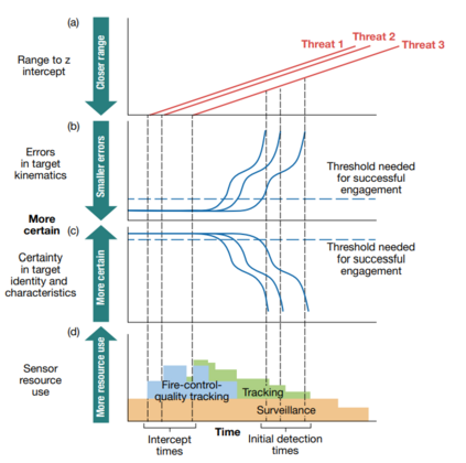 图8. 一个典型的针对突袭威胁的交战序列。一旦探测到目标,就开始收集传感器数据,最终达到足够的运动学准确性和身份及特征的确定性,以实现成功交战。在整个交战过程中,满足这些阈值的传感器资源需求是不同的。