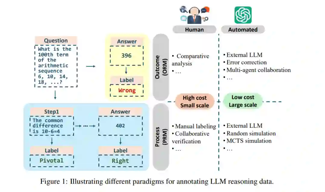 3.3 LLM自动化过程标注 在复杂的推理任务中,模型输出的每一步都可能显著影响最终结果,因此必须将中间决策标记为“正确”、“错误”或分配中间奖励,即过程标注。然而,手动标注这些步骤既昂贵又耗时。例如,Lightman等人[75]投入了大量人工努力来生成大规模过程标注数据集,即PRM800K,该数据集满足了训练有效过程奖励模型(PRM)的要求,并大大增强了LLMs的推理能力。因此,自动化方法越来越需要高效的过程标注,以确保可扩展性和成本效益。最初的自动化方法雇佣外部更强的LLMs来标注由较小LLMs生成的中间过程。此外,基于蒙特卡罗的方法减少了对外部更强LLMs的依赖,可以使用较弱的LLMs完成数据标注,从而通过自我强化的方式训练更强的LLMs。 使用更强的LLM进行标注:作为一种直接的自动化标注方法,Luo等人[84]设计利用更强大的外部模型来标注生成模型推理过程的中间结果。该方法不依赖人工标注,而是使用预训练的高性能模型(如GPT系列)来评估每个生成的步骤。通过利用更强外部模型的能力,这种方法提高了标注过程的准确性和可扩展性,使其更适合大规模任务。然而,这种方法的主要限制在于其对高度能力的外部模型的依赖,这意味着标注过程的性能最终受限于所使用的外部模型的能力。 通过蒙特卡罗模拟进行标注:为了减少对强大外部模型的依赖,Wang等人[148]和Wang等人[156]提出了一种改进方法,避免直接评分中间步骤。相反,他们的方法使用外部模型从给定的中间输出继续推理几步,并随机重复此模拟过程多次。然后基于这些扩展推理的平均结果评估中间步骤的质量。这种蒙特卡罗方法在数学问题解决和代码生成等任务中显示出有前景的结果。 通过树搜索模拟进行标注:使用多步蒙特卡罗模拟与外部模型来评估中间步骤质量的方法已成为自动化过程标注中最广泛使用的方法之一。为了进一步提高该方法的效率,Luo等人[85]提出了一种改进方法,用蒙特卡罗树搜索(MCTS)策略取代重复的蒙特卡罗模拟。在这种改进方法中,使用MCTS从中间步骤生成多个代表最终推理结果的叶节点。然后基于这些叶节点的平均结果评估中间步骤的质量。与随机重复推理相比,MCTS利用树搜索提高推理质量,同时允许叶节点共享高质量的父节点,减少计算开销并提高效率。该方法在数学问题解决中表现出优越的性能,超越了人工标注。 在基于MCTS的模拟基础上更进一步,Zhang等人[183]在过程标注中引入了自我精炼机制。他们利用获得的过程标注训练过程奖励函数(PRM),进而提高大型语言模型(LLM)的性能。精炼后的LLM随后用于重复基于MCTS的模拟,生成更高质量的标注。这种涉及改进循环的迭代过程,通过迭代增强逐步提高了过程标注的质量。该方法在多个任务中表现出色,包括数学问题解决、问答和多领域知识推理,展示了其通过迭代增强不断精炼和提高标注质量的有效性。