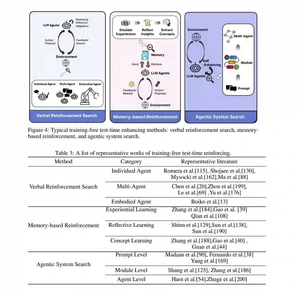 语言强化搜索(VRS)利用LLMs的预训练推理和语义能力来探索和优化解决方案空间。与传统的强化学习或训练密集型方法不同,VRS纯粹通过测试时推理操作,使用迭代反馈循环来精炼解决方案,而无需额外训练。通过利用LLMs中编码的语义知识及其遵循复杂指令的能力,VRS提供了一种多功能的方法来导航多样化的问题空间。这种推理驱动的框架在个体代理、多代理系统和具身代理中找到了应用,支持广泛的任务,包括程序优化、协作决策和现实世界中的交互。本节通过这三个关键方面分析VRS,深入探讨每个类别中呈现的方法论和独特见解。 在个体代理设置中,VRS依赖迭代推理和反馈机制来在结构化问题空间中精炼解决方案。这种方法非常适合数学优化、符号推理和假设驱动发现等任务,其中系统精炼显著改善了问题解决结果。数学发现研究展示了VRS如何将问题解决过程重塑为动态迭代循环。例如,对组合问题(包括帽集和在线装箱)的研究突出了通过反馈驱动评估演变的程序化解决方案[115]。同样,符号回归研究将方程视为动态构造,迭代生成、评估和优化数学表达式[130]。这些方法展示了VRS如何在约束空间中导航,在效率和准确性上超越传统优化技术。在科学发现中,VRS展示了其在整合推理与实证数据和模拟中的实用性。研究人员开发了通过综合多样化数据源进行生物医学假设精炼的系统。例如,在肿瘤学中的应用使用迭代综合来解决多尺度数据的复杂性[162]。在物理科学中,VRS用于通过模拟反馈精炼假设,推进分子设计和物理定律发现等领域[88]。这些发现强调了VRS在连接抽象推理与现实世界验证中的作用,支持数据密集型和假设驱动型任务。启发式优化中的反思过程进一步展示了VRS的灵活性。例如,研究人员探索了迭代生成和评估解决组合问题的策略[174]。这种方法专注于创建适应性超启发式,通过反馈循环不断精炼解决方案,从而在不同领域中有效泛化。总体而言,VRS应用迭代推理和反馈将抽象问题解决与现实世界应用连接起来,以精确和适应性解决数学、科学和优化中的挑战。 在多代理系统中,VRS通过自然语言通信促进LLM代理之间的协作。这些系统利用共享推理和迭代精炼来应对复杂的解决方案空间,允许代理交换见解并实现共同目标。异构信息网络(HINs)中的元结构发现展示了VRS在多代理上下文中的应用。最近的研究结合了LLM推理与进化优化来精炼元结构,增强了其可解释性和预测准确性[20]。同样,在社会经济预测中,多代理系统整合知识图谱和元路径推理,为人口估计和经济活动预测等应用提取跨任务见解。这种方法促进了LLM代理之间的协作,并提高了多任务环境中的性能[199]。因果发现也受益于VRS启用的多代理框架。例如,使用LLMs作为推理代理的系统协作辩论并提出因果关系。通过结合统计方法和自然语言交互,这些框架生成准确的因果图,同时解决因果关系中的歧义[69]。在金融决策中,VRS增强了层次协作。FINCON框架采用经理-分析师系统,通过概念性语言强化精炼金融策略。通过最小化冗余通信和改进策略精炼,FINCON展示了VRS在优化金融决策过程中的实用性[176]。通过迭代精炼和共享推理,VRS支持多代理系统应对复杂任务,如元结构精炼、社会经济预测和金融决策。 在具身代理设置中,VRS用于通过整合推理与物理交互来解决现实世界任务,支持实验室环境中的实验规划和执行等活动。这些系统将VRS扩展到动态环境,结合语义推理与实际实验。例如,自主化学研究展示了使用LLM驱动的系统独立设计、执行和精炼实验[13]。这些代理整合了工具,如机器人液体处理器、光谱设备和基于网络的研究模块,以执行反应优化和化合物合成等任务。一个应用涉及优化钯催化的交叉偶联反应,其中系统使用自然语言提示确定条件、计算化学计量并自主执行实验。当面对错误(如错误的模块调用)时,系统通过参考文档并迭代任务来修订其方法。这种迭代过程展示了VRS如何在实验工作流程中支持适应性和精确性。通过结合推理和实时反馈,具身代理展示了VRS在动态环境中精炼和优化复杂过程的能力。这些系统减少了人类干预,同时加速了科学发现,使其成为现实世界实验和创新的宝贵工具。 总的来说,先前的研究展示了VRS在个体代理、多代理系统和具身代理中的适应性和有效性。利用LLMs的语义推理和迭代反馈能力,VRS无需额外训练即可应对广泛任务。从数学和科学背景中的结构化优化到多代理框架中的协作探索,再到现实世界应用中的动态实验,VRS提供了一种统一的问题解决方法。VRS作为一个多功能框架,能够在计算和物理领域中应对复杂挑战,同时推动多样化领域的进步。 7.2 基于记忆的强化 当应用于开放式任务(如创意写作、复杂逻辑推理和开放世界游戏)时,解决方案空间往往会急剧扩展,通常变得无界或定义不清。这些任务通常需要与环境持续交互以获取相关信息,使得简单的解决方案空间搜索效率低下。为了解决这些挑战,一些研究为LLM代理引入了外部记忆模块。该模块存储了诸如观察、过去试验中的成功和失败行动等信息。代理通过记忆作为语言强化学习的基础,迭代探索其环境。通过这一过程,它们总结经验,提取解决方案空间的可解释高级见解,并在后续试验中精炼其行动,从而提高推理性能。这些研究不仅关注探索外部解决方案空间,还强调LLM