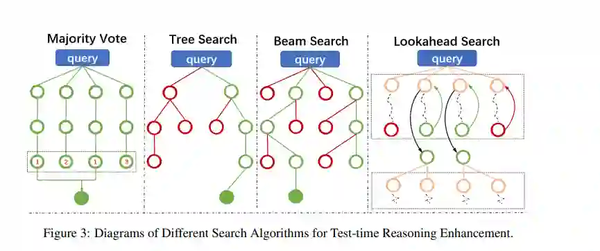 5.1 通过提示引发深思熟虑的思考 除了通过强化学习等技术进行训练时优化外,研究人员发现,测试时提示技术(如思维链和思维树)可以进一步增强LLMs的能力[160, 153]。虽然简单地要求模型直接回答通常会产生次优结果,但在测试时通过明确的推理过程引导它们可以显著提高其性能[62]。这些提示策略在从数学推理到复杂决策任务的各种领域中显示出显著的有效性[173, 196]。结构化提示方法(如ReAct和Least-to-Most Prompting)的出现表明,LLMs可以从明确的思维过程组织中受益,从而产生更可靠和可解释的输出[189]。尽管这些方法通常会增加标记消耗和计算开销,但它们为通过复杂的测试时干预提高LLM性能提供了有前景的方向,而无需依赖模型架构或训练修改[172, 11]。这表明,通过复杂的测试时干预而不是仅仅依赖模型架构或训练修改,可以有效地提高LLM的推理能力和解决方案准确性。 5.2 PRM引导的搜索 如前所述,PRM标志着从稀疏结果反馈到详细过程导向监督的重大转变。更重要的是,PRM还可以在测试时阶段使用,从而进一步提升模型的推理能力。OpenAI o1系列模型是PRM高级应用的突出示例。新的测试时扩展定律表明,通过增加测试时计算资源,可以有效地增强推理能力,为LLMs的未来发展提供了明确的方向。我们介绍了一些在推理阶段应用的方法,如图3所示。红色空心圆表示算法在推理阶段探索过程中丢弃的推理路径,绿色空心圆表示在探索过程中采用的推理路径,绿色实心圆表示一旦找到正确答案,推理路径的终点。 多数投票:多数投票是从密集测试时计算中生成一个最终答案的最直接策略。在推理过程中,每个推理轨迹都会对给定输入产生一个预测。基本思想是选择大多数推理轨迹一致的答案。然后聚合所有模型的预测,选择出现次数最多的类别(“多数投票”)作为最终输出:f∗=argmaxf∑yIfinal_ans(y)=ff∗=argmaxf∑yIfinal_ans(y)=f,其中II是指示函数,yy是每个评估轨迹。 树搜索[15]:树搜索是一种经典算法,通过递归构建搜索树系统地探索不同选择。它通常用于复杂决策问题,如棋盘游戏和规划任务。蒙特卡罗树搜索(MCTS)是最广泛使用的树搜索方法之一。它由四个主要步骤组成:选择、扩展、模拟和回传。通过逐步扩展搜索空间,MCTS逐步改进决策。树搜索已经在一些LLM推理任务中应用,取得了显著成功。例如,思维树框架[172]使LLMs能够考虑多个推理路径,这些路径被结构化为树。它结合了自我评估以做出深思熟虑的决策,确定下一步的最佳行动方案。这种方法显著提高了模型推理的性能。 束搜索[133]:束搜索是贪婪搜索的改进版本,通常用于生成任务中以选择最佳输出序列。其主要思想是在每个时间步从所有候选路径中保留得分最高的前K条路径(称为束)以进行进一步扩展。与贪婪搜索不同,束搜索维护多个候选路径,从而扩展搜索空间并提高生成质量。束搜索广泛应用于LLM推理。例如,BART[71]使用束搜索作为其主要推理策略,展示了其在文本生成任务中的卓越效果。 前瞻搜索[134]:前瞻搜索是另一种有前景的方法,具有显著增强LLM推理的潜力。它修改了束搜索中每个步骤的评分机制。前瞻搜索不是仅基于当前步骤的得分选择最佳候选,而是通过向前模拟最多kk步来执行前瞻搜索。如果在向前模拟过程中达到解决方案终点,则提前停止。在前瞻搜索过程中,使用预训练且冻结的预测奖励模型对模拟的每个步骤进行评分。基于PRM在kk步模拟中的累积得分,决定保留或丢弃束分支。这种策略通过在每个评估步骤中引入更多上下文来改进决策。与束搜索相比,前瞻搜索增加了探索空间的深度,允许基于更远的模拟决策结果判断当前决策。然而,它也增加了对计算资源的需求,在计算资源有限的情况下可能导致性能下降。