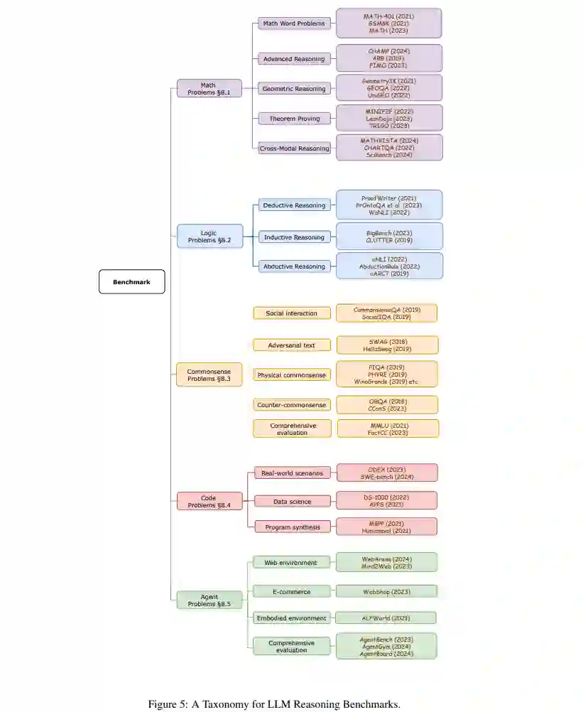 设计一个稳健的基准对于记录LLMs能力的改进至关重要。它还在选择有前景的研究方向以进一步推进方面发挥着关键作用。在本节中,我们系统地回顾了LLM推理的流行基准,这些基准在图5的分类中进行了总结。我们讨论这些基准如下。 8.1 数学问题 数学推理已成为评估LLMs推理能力的关键测试平台。数学推理基准的领域从基础算术到高级大学数学,提供了系统评估数学理解和问题解决能力的不同方面的方法。 在数学应用题(MWP)领域,基准从基本算术运算逐步发展到日益复杂的问题解决场景。在基础层面,MATH-401[177]等数据集通过401个精心构建的表达式评估纯算术能力,而MultiArith[116]和AddSub[51]评估将简单应用题转化为数学运算(如加法或减法)的能力。在小学和高中层面,综合数据集如GSM8K[24]和MATH[50]提出了更复杂的多步推理挑战,GSM8K提供了8.5K个小学问题,MATH提供了12.5K个跨多个数学领域的问题,难度逐渐增加。 高级数学能力的评估主要通过竞赛和专门测试数据集进行。CHAMP[92]和ARB[5]等集合提出了竞赛级别的问题,需要复杂的问题解决策略,而MATHQA[5]则结合了GRE和GMAT考试中的标准化测试问题。在最高级别,FIMO[78]等数据集挑战模型解决国际数学奥林匹克问题,测试自动化数学推理的极限。 几何推理代表了一个需要空间理解和形式数学证明的独特类别。Geometry3K[82]和GEOQA[19]等数据集提供了专门的几何问题,而UniGEO[18]提供了一个统一的几何推理任务框架,专注于计算和证明。这些基准特别有价值,用于评估模型连接视觉和数学推理的能力。 定理证明和形式数学领域已经发展到包括严格的评估框架。MINIF2F[193]和LeanDojo[170]专注于与Lean定理相关的形式数学证明,而THEOREMQA-MATH[23]则考察数学定理的理解。TRIGO[166]和PISA[57]等专门数据集解决了数学推理的特定领域,如三角学和形式证明系统。 最后,跨模态数学推理已成为一个关键领域,反映了数学问题在现实世界中的多样化呈现方式。MATHVISTA[81]和CHARTQA[93]通过图表和图表评估视觉数学推理,而TABMWP[83]和MultiHiertt[192]评估模型处理表格和文本数据的能力。SciBench[151]弥合了纯数学与科学应用之间的差距,测试了LLMs在更广泛科学背景下的数学推理能力。 8.2 逻辑问题 建立在数学推理能力之上,系统逻辑推理能力是评估LLMs认知能力的另一个基本标准。虽然数学推理侧重于定量操作和形式证明,但逻辑推理涵盖了更广泛的推理能力,包括得出有效结论、识别模式和生成跨多样化上下文的合理解释。根据Luo等人[86]的分类,逻辑推理可以分为三种主要类型:演绎推理、归纳推理和溯因推理。每种类型代表了一种独特的认知过程,对于全面逻辑分析至关重要,同时在认知评估中保持相互联系。 演绎推理,也称为基于前提的推理,涉及从一般原则中得出特定结论,具有绝对确定性。例如,给定一组关于实体之间关系的规则,模型必须确定哪些特定关系必须为真。ProofWriter[140]是这一类别的典型代表,要求模型从给定前提构建明确的逻辑推导。其他基准,如FOLIO[46]和PrOntoQA[119]评估自然语境中的一阶逻辑推理,WaNLI[77]引入了日益复杂的评估标准,包含107,885个示例。 归纳推理强调从特定观察中识别模式并推广到更广泛的原则[47]。这涉及识别潜在规律并将其扩展到新情况,处理概率而非确定性。BigBench[136]包含众多专门组件,用于检查高级模式推理能力。此外,CLUTTR[132]基准系列通过不同复杂度的关系模式评估这一能力。 溯因推理,也称为解释性推理,指的是为一系列观察或事实形成最可能解释的过程,尽管结论并不保证确定性[34]。这种推理类型测试模型如何处理信息不完整的场景,通过生成合理的解释。ααNLI[99]基准通过叙事完成任务实现了这一点,模型必须选择给定情况的最可能解释。AbductionRule[175]系列提供了跨不同领域的结构化评估框架,具有特定变体用于动物相关和人物相关的推理场景。ααARCT[100]特别考察了选择和证明合理解释以及论证理解的能力。 8.3 常识问题 常识推理仍然是NLP中的一个重要挑战,旨在评估LLMs理解和应用日常常识知识的能力。有各种基准针对常识推理任务的不同维度。例如,CommonsenseQA[141]要求模型回答基于常识知识库的推理问题。 SocialIQA[118]专注于社交互动常识推理,围绕社交场景中的因果推理展开。相比之下,SWAG[178]和HellaSwag[179]等数据集引入了对抗性文本推理任务,模型必须基于上下文线索预测事件的最可能延续,从而增加任务复杂性。对于物理常识推理,PIQA[12]和PHYRE[10]等基准专注于评估模型对日常物理任务和交互推理场景的理解。PIQA主要使用问答任务,而PHYRE强调交互物理模拟。类似地,WinoGrande[117]在Winograd Schema Challenge的基础上引入了更大规模的数据集和更复杂的消歧任务,以测试语义理解和共指解析能力。 其他工作,如OBQA[95]和CConS[63],探索了模型在反常识上下文中的表现,突出了当前模型在隐式推理和背景知识利用方面面临的挑战。最近,综合基准如MMLU[49]和关键研究如FactCC[66]进一步分析了LLMs的常识推理和事实推理。这些基准为评估和改进语言模型在多样化常识推理任务中的表现提供了宝贵的视角。