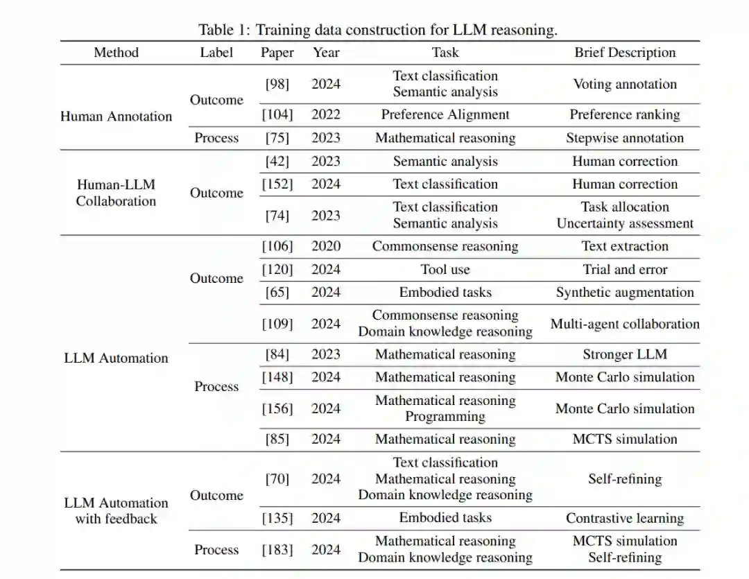 创建大规模、高质量的推理数据集对于增强LLMs的推理能力至关重要。然而,由于成本高昂,这一任务面临重大挑战。如图1所示,人工标注被广泛认为是高质量的,但其成本高昂且难以扩展。相反,使用LLMs自动化标注过程提供了一种更具成本效益的替代方案,但面临验证有限的挑战,特别是对于逐步推理过程。在本节中,我们回顾了该领域的最新研究进展(总结在表1中),强调了从人工标注到LLM自动化的转变。 3.1 人工标注 人工标注在构建LLMs数据集中的作用是不可或缺的。人工标注者以其细致、耐心和精确性为特征,同时也具备适应新场景和处理模糊数据的能力。Zhou等人[195]证明,即使使用最少的人工标注数据,模型也能实现强大的性能,突出了精心策划的标注在模型有效性中的关键作用。人工标注数据在增强大型语言模型的推理能力方面发挥了关键作用。在人类反馈强化学习(RLHF)的背景下,来自人工标注者的偏好数据使LLMs能够与复杂的人类价值观和伦理考虑保持一致。这种通用的标注方法有助于针对特定任务微调模型。基于这一基础,Lightman等人[75]展示了使用人工标注者评估数学推理过程中每一步推理质量的有效性,显著提高了LLM推理的准确性。这突显了人工标注如何弥合一般训练数据与领域特定挑战(如复杂推理任务)之间的差距。 增强LLMs的推理能力需要过程监督,即人工标注者指导推理过程的每一步[75]。然而,这种监督需要大量的人工标注数据,使其资源密集且不可持续。鉴于LLM训练通常需要TB级的数据,其数量对模型性能至关重要,完全通过手动标注构建数据集变得越来越不切实际。这突显了在不依赖人工标注的情况下改进推理的替代方法的需求。一种有前景的方法是人与LLMs协作进行标注,利用LLMs加速标注过程,同时保持人工生成标注的高质量。具体来说,标注过程可以分为两个阶段:预标注阶段和精炼阶段。在预标注阶段,LLMs可以用于执行初始标注,利用少量手动提供的示例进行快速高效的设置[42, 61]。在精炼阶段,人工标注者可以评估LLM生成标注的质量,并专注于纠正质量较差的标注子集[61, 152, 96, 42]。为了实现可扩展的标注过程,最近的工作越来越关注如何在确保数据质量的同时最大化自动化,从而在不影响标注准确性的情况下减少人工参与。