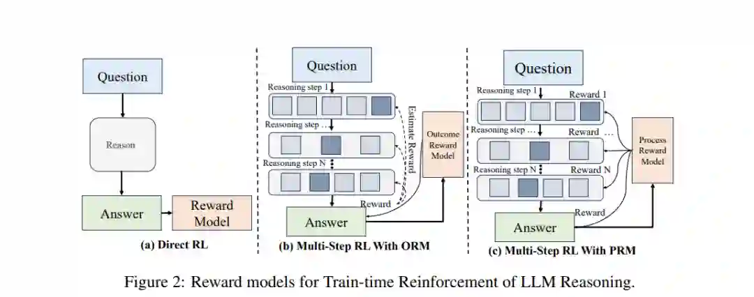过程奖励模型(PRM)基于强化学习代表了LLM推理的重大进步,强调评估中间步骤而不是仅仅关注最终结果。如图2(c)所示,PRM的奖励分布在每个推理步骤中,而不是集中在最终结果上。通过在整个推理轨迹中提供细致的反馈,PRM使模型能够优化行为,使其更符合人类偏好和复杂任务要求。这种方法对于涉及顺序决策的任务至关重要,其中中间步骤或决策对最终目标具有重要意义。我们探讨PRMs的演变,并强调它们在通过提供复杂任务中的步骤级奖励来改进推理方面的作用。 经典强化学习:一系列近期工作将PRMs应用于数学或逻辑推理,因为OpenAI的一项开创性工作[75]证明了过程奖励的重要性。SELF-EXPLORE[55]使用PRMs通过识别和纠正“第一个坑”(即问题解决中的初始错误步骤)来增强数学推理。通过奖励纠正这些错误的步骤,PRMs实现了无需大量人工标注的自监督微调。该模型通过利用步骤级细粒度反馈,在GSM8K和MATH等数学基准上实现了显著的准确性提升。MATH-SHEPHERD[149]引入了一个PRM框架,用于数学推理任务中的逐步验证和强化。通过自动化过程监督(使用MCTS启发的方法),MATH-SHEPHERD消除了对人工标注的需求,同时确保了多步问题解决的高准确性。PRMs用于强化逻辑进展和正确性,从而在GSM8K和MATH等基准上提高了性能。DeepSeekMath通过组相对策略优化(GRPO)[128]集成了PRMs,这是一种优化步骤级奖励的RL算法。PRMs用于增强数学推理和跨领域的推理一致性。通过专注于中间推理步骤,DeepSeekMath在多个基准上实现了最先进的性能,展示了PRMs在数学领域的强大能力。扩展自动化过程验证器引入了过程优势验证器(PAVs),一种PRM变体,用于评估问题解决中的步骤级进展[123]。PAVs使用步骤级监督来提高搜索算法和强化学习的效率和准确性。通过专注于对正确解决方案有意义的进展步骤,PAVs在样本效率、计算效率和推理准确性方面相比结果奖励模型实现了显著提升。这展示了细粒度过程奖励在扩展LLM推理能力中的重要性。 交互式过程奖励模型:PRMs还应用于交互任务,如对话和多轮问答。ArCHer采用分层RL方法,使用PRMs训练代理处理多轮、长视野任务[198]。它实现了一个双层系统:高层价值函数评估话语级奖励,而低层PRM优化每轮内的逐标记生成。这种分层结构确保了更有效的信用分配,并允许对语言模型进行细致训练,以处理多轮交互和推理任务。PRMs的使用使ArcPier能够高效扩展,在代理任务中实现了显著的样本效率和性能提升。多轮偏好人类反馈强化学习[126]将PRMs集成到多轮强化学习中,以优化长期目标与人类反馈。多轮偏好优化(MTPO)算法比较整个多轮交互以生成偏好信号,其中PRMs用于分配逐步奖励。这使得LLM代理能够将行为与长期目标对齐,提高动态、多轮任务(如对话和战略决策)的整体性能。 直接偏好优化:一些近期研究利用MCTS通过直接偏好优化[165, 17, 183, 16]实现多步推理任务的优化。例如,SVPO[17]使用MCTS自动标注多步推理任务的步骤级偏好。从学习排序的角度,它训练一个显式价值模型以复制隐式奖励模型的行为。此外,SVPO将显式价值模型与DPO集成,其中价值模型不仅帮助策略模型导航更高效的推理路径,还指导偏好学习。然而,这些工作主要集中在首先收集偏好数据或训练奖励模型,然后基于静态数据和预训练奖励模型执行策略优化。Xie等人[165]通过将数据收集和策略偏好优化集成到一个迭代过程中,推进了这些方法。这种方法可以被视为直接偏好优化的在线版本,其中更新后的策略迭代地用于通过MCTS收集偏好。 LLMs多步RL技术的演变反映了从稀疏结果反馈到详细过程导向监督的转变。PRMs现在成为LLM推理能力进步的核心,提供了细致的步骤级奖励,推动了推理任务的显著改进。未来的研究可能会专注于精炼这些模型并扩展其在不同任务领域的适用性。