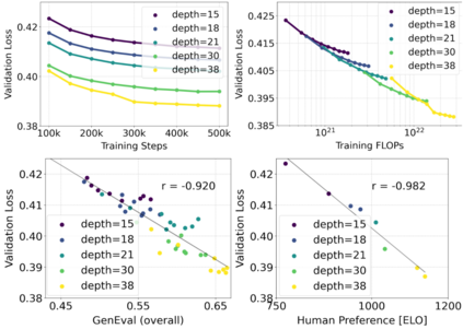 作者利用重新加权的 Rectified Flow 公式和 MMDiT 骨干对文本到图像的合成进行了扩展(scaling)研究。他们训练的模型从带有 450M 个参数的 15 个块到带有 8B 个参数的 38 个块不等,并观察到验证损失随着模型大小和训练步骤的增加而平稳降低(上图的第一行)。为了检验这是否转化为对模型输出的有意义改进,作者还评估了自动图像对齐指标(GenEval)和人类偏好分数(ELO)(上图第二行)。结果表明,这些指标与验证损失之间存在很强的相关性,这表明后者可以很好地预测模型的整体性能。此外,scaling 趋势没有显示出饱和的迹象,这让作者对未来继续提高模型性能持乐观态度。