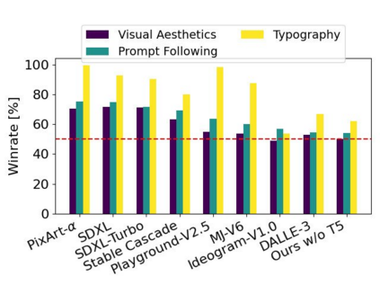 以 SD3 为基准,这个图表概述了它在基于人类对视觉美学、提示遵循和文字排版的评估中的胜率。