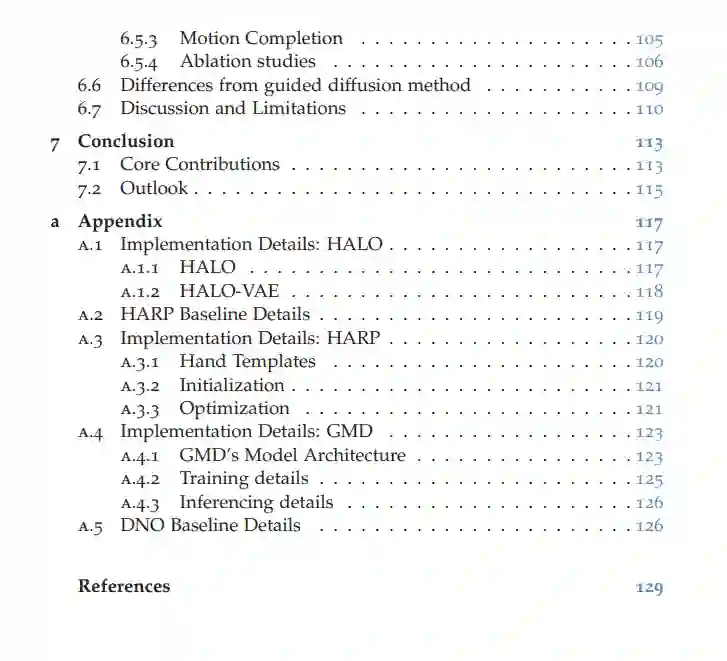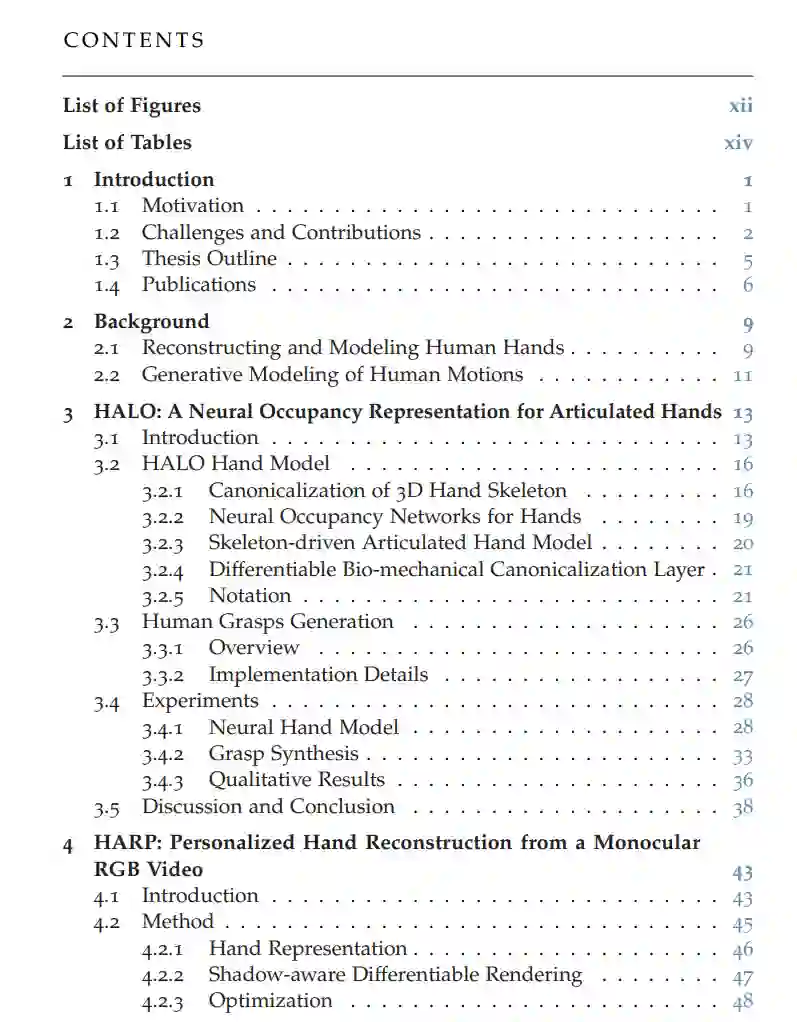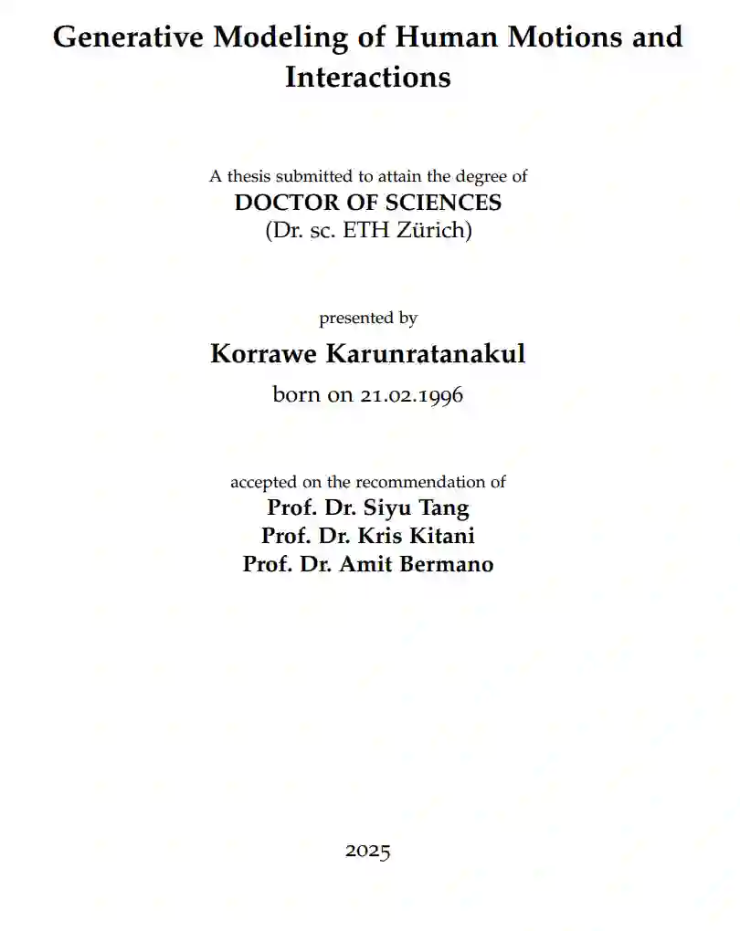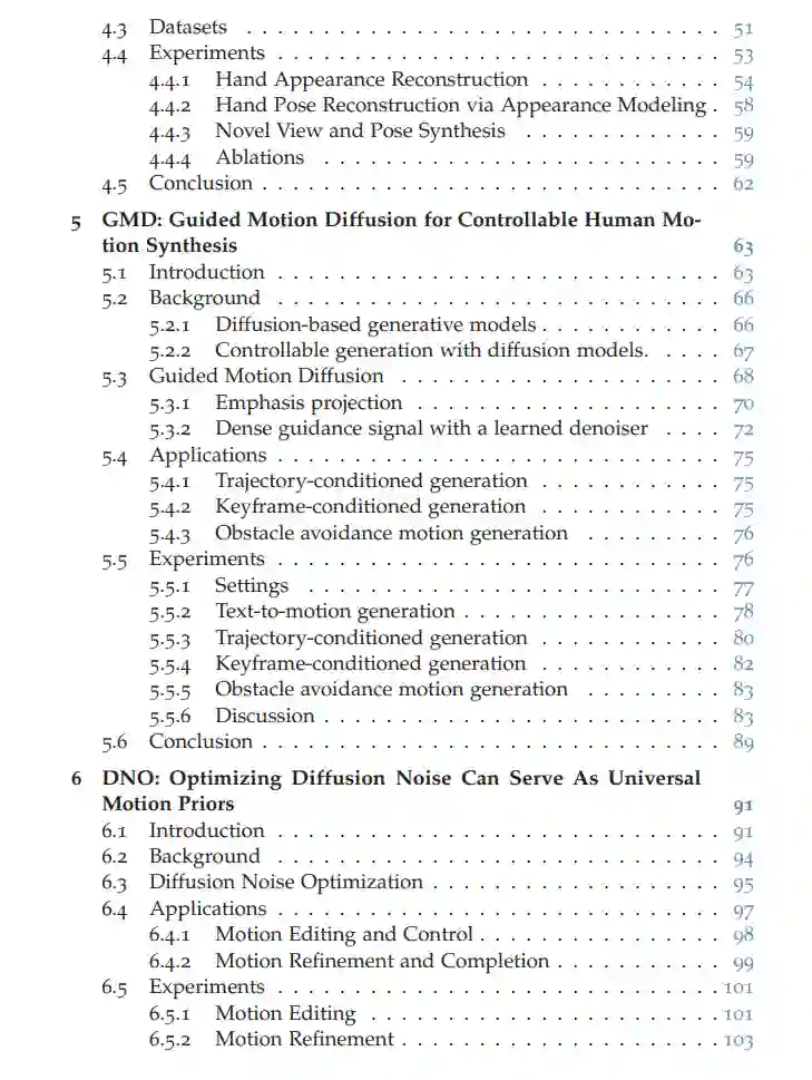 《人类动作与交互的生成式建模》世界的快速数字化深刻改变了日常生活的方方面面。从虚拟现实到自动驾驶,能够理解并驾驭三维空间的智能机器在这一进程中变得愈发重要。为了确保物理与数字空间的无缝交互,这些系统必须精确捕捉环境细节,并理解人类如何与周围世界互动。这一挑战的核心在于人类动作与交互的建模。人类行为受多种因素影响——无论是与不同物体的互动,还是环境布局的差异,都使得动作的多样性与环境的复杂性成为学习算法的重大挑战。此外,环境中无数可能微妙影响行为的细节,使得覆盖所有潜在场景的完整数据采集变得几乎不可能。本论文通过开发通用生成式建模框架应对上述挑战,这些框架能抽象化单个场景的具体特征,同时轻松适配新环境。我们重点研究人类交互的两大核心要素:手部动作与全身运动。核心贡献手部建模突破HALO(手部关节占据模型):弥合了基于骨骼与基于网格的手部模型间的鸿沟,通过关键点低维空间实现手部姿态的生成式建模,同时保留对手部交互至关重要的高保真表面细节。HARP(手部重建与个性化系统):通过单目视频还原手部外观细节,进一步提升了手部表观建模能力。全身运动生成引导运动扩散模型(GMD):基于去噪扩散模型(在图像生成中已获成功),开发了注重可控性的运动生成模型。GMD将稀疏空间约束有效融入运动合成,确保生成动作符合物理规律,适用于需要精确空间控制的游戏与虚拟现实应用。动态环境适配扩散噪声优化(DNO):将训练好的扩散模型转化为通用运动先验,无需针对每项任务重新训练模型即可支持运动编辑、去噪、混合及环境适配。DNO通过消除逐任务微调需求大幅降低训练成本,扩展了生成模型的应用场景。研究意义本论文通过提升生成式建模的真实感与适应性,推动了人类动作与交互建模的发展。我们的目标不仅是增强数字环境中人类动作的复现能力,更为理解人类行为及未来三维世界导航应用的开发奠定基础。