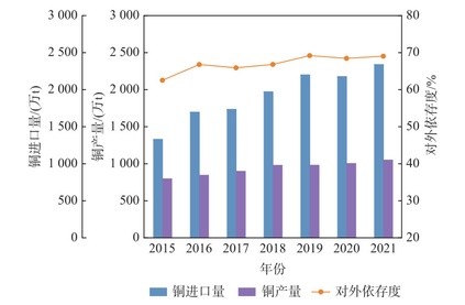 注:数据来源于中国海关总署、中国统计年鉴图2 2015年至2021年中国铜对外依存状况