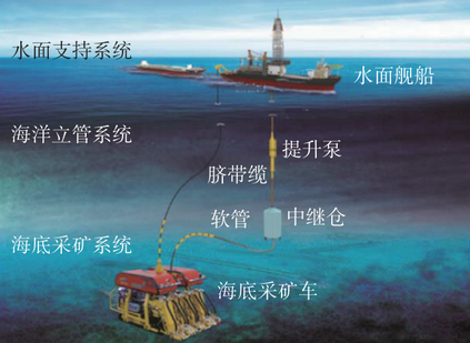 表3 中国向国际海底局申请的矿区 注:COMRA全称为ChinaOceanMineralResourcesR&DAssociation;矿区相关信息来源于中华人民共和国驻国际海底管理局代表处 深海采矿系统大体可分为海面支持系统,海洋立管运输系统与海底采矿系统三大部分(见图12)。深海采矿系统与深海石油开采系统既有诸多相通之处,如涉及超大水面平台-超长立管-单点海底装备的多体多尺度系统之间的相互影响,及多体结构与多场环境之间强非线性流固耦合作用。同时,海底矿面式赋存形态又导致与固定静止的深水石油开采平台不同而独具特色:如采矿系统呈现水面平台巡弋、立管受迫振动和海底采矿车主动运动的多模态交互式干涉。
