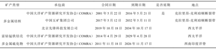 注:图片来源于Hein和Koschinsky 图11 海底矿产与分布 《中共中央关于制定国民经济和社会发展第十四个五年规划和二〇三五年远景目标的建议》中,多次提到深海资源开采相关科研和产业。2021年9月,中国工程院院士金东寒在中国工程科技发展战略天津研究院重大咨询研究项目“新形势下深海采矿战略研究”启动会致辞中表示:深海采矿是我国深海战略的重要组成部分,深入研究我国深海采矿战略,对于我国加快建设海洋强国,实现高水平科技自立自强具有重要意义。至今,我国在国际海底共申请了五块矿区勘探权(见表3)。根据联合国海洋法公约及其相关文件,享有优先开采权。然而,我国在深海资源开发技术研发领域起步较晚,作业水深达6000m的矿产资源开发更需要大力创新和技术跨越式升级。