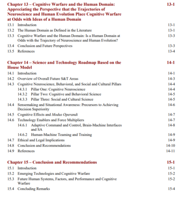 CogWar使对手有能力塑造人类的认知、感知、感觉、态势感知和各个层面的决策。故意(误)用数字网络中的信息并在社交媒体等各种平台上进行全球传播的能力,为对手带来了新的工具和方法。CogWar还旨在破坏关系,并针对个人和国家层面的人类脆弱性,如信任和认知偏见,其影响遍及所有作战领域。本报告概述了减轻和抵御 "逻辑战争 "所需的关键科技领域。