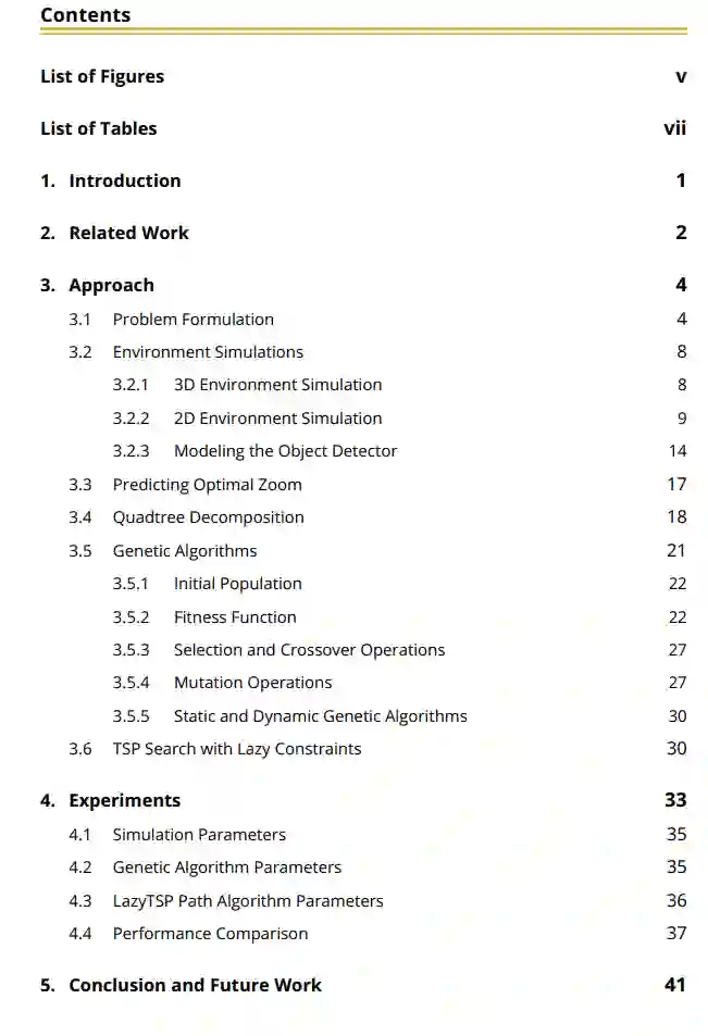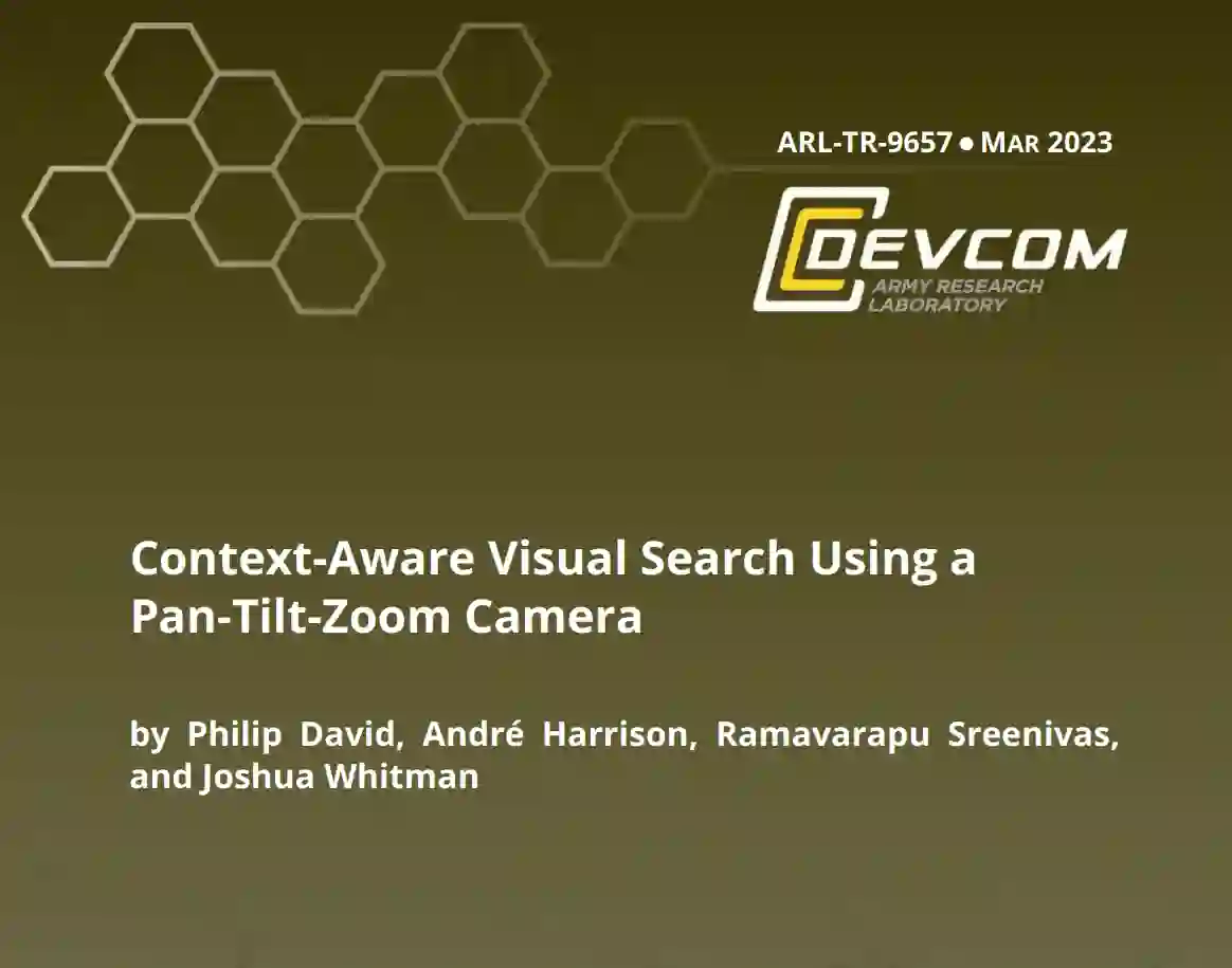 需要在大型室内和室外环境中执行视觉监控,在这些环境中,感兴趣区域(ROI)的水平视角跨度可达 360◦,并具有非常大的景深(例如 1 千米或更多)。在某些情况下,物联网(IoT)方法允许多台分布式摄像机合作勘测一个大的 ROI,而在其他情况下,如移动机器人的监控,则需要由少量的共用摄像机勘测 ROI。在后一种场景中,现有的双摄像头方法使用广角摄像头来提示平移倾斜变焦(PTZ)摄像头,但这种方法存在不足,因为系统无法在广角摄像头图像中观察到非常遥远的物体和感兴趣的事件,因此无法提示 PTZ 摄像头。据我们所知,我们是第一个解决资源受限的 PTZ 摄像机搜索广角图像中无法观察到的物体这一监控问题的人。在本报告中,我们首先提出并正式定义了这一问题。接下来,我们提出了使用单个 PTZ 摄像机智能、高效地搜索大范围 ROI 中感兴趣物体的解决方案。最后,我们介绍了在模拟 3D 环境中进行的实验结果。
