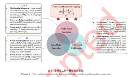 信息领域的研究热点常常在获取—处理—反馈中迭代, 尤其前两者. 目前, 深度学习等处理方法 的发展如火如荼, 下一个热点很可能是数据获取, 那么多模态将会迈入新的发展阶段. 本文抛砖引 玉, 挂一漏万, 回顾了多模态认知计算的发展历程, 从理论, 方法和趋势三个方面展开分析与思考. 首 先, 构建信息传递模型刻画了机器从事件空间中提取信息的过程, 探讨了多模态认知计算的理论意 义. 然后, 阐述了多模态关联, 跨模态生成, 多模态协同三个主线任务的理论联系, 对各项任务进行了 统一. 通过对现有方法的分析与对比, 较为全面地展示了多模态认知计算的发展现状和关键技术. 进 而, 结合当前人工智能的发展背景, 从信息度量, 融合机制, 学习任务和数据获取等方面探讨了多模 态认知计算面临的挑战, 并讨论了未来值得探索的研究方向. 最后, 对多模态认知计算的开放性问题 进行了一些设想. 实际上, 人类能感知到的模态信息是有限的. 人类仅可以看到 400-700nm 的可见 光, 这是光谱中这很小的一部分; 只可以听到 20-20000Hz 的可闻声波, 这也是声波很小的一部分. 庆幸的是, 借助各种先进的光电设备, 我们感知到了可见光和可闻声波之外的更多信息. 未来, 随着感 知能力的进一步提升, 依托人类认知拓展物理感知边界, 实现信息域和认知域的统一, 是大势所趋. 希望本文能够为提升智能光电设备的感知能力和推动多模态认知计算的理论研究提供参考和启发。