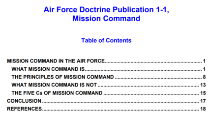 本条令的发布就是朝着这个方向迈出的一步。然而,条令只是 DOTMLPF-P 框架的一个组成部分。实现任务指挥所提出的愿景需要采取全面的行动。要在美国空军实现任务指挥,还需要在美国空军组织结构、培训方法、物资采购、领导力和教育模式以及人员和人力视角等方面进行更多计划中的、预期中的和未知的变革。本《空军发展计划》为这些变革提供了动力,但只有空军人员接受本计划所述原则,并在全军各级和各方面应用这些原则,这些变革才能实现。