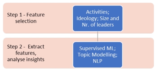 在本文中,我们旨在解决这一挑战,同时借鉴现有的工作,将数据驱动(数据科学和人工智能)和分析师驱动(定性、理论驱动)的见解结合起来(Pherson & Pherson, 2020;Westerveld, Powell & Eles, 2020)。其结果是图示的方法,它使用了人工智能(AI)技术的组合,从公开来源中提取关于暴力组织在一段时间内的定义性特征的信息。通过这样做,我们希望支持分析师处理信息过载的问题,并向为国防从业人员提供决策支持工具迈出一步,以了解不断变化的威胁。具体来说,我们以组织理论、情报分析和人工智能方面的文献为基础并加以扩展,以解决以下研究问题: