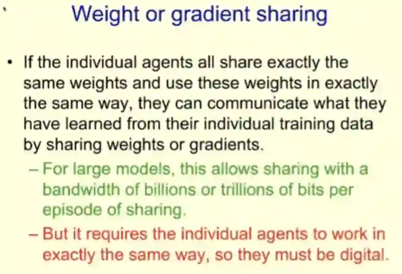 对于数字模型,我们可以通过复制创建大量使用相同权重的智能体。我们可以让这些智能体查看训练数据集的不同部分,让它们各自基于不同部分的数据计算权重的梯度,然后再对这些梯度进行平均。这样一来,每个模型都学到了其它每个模型学到的知识。这种训练策略的好处是能高效处理大量数据;如果模型很大,就可以在每次共享中共享大量比特。